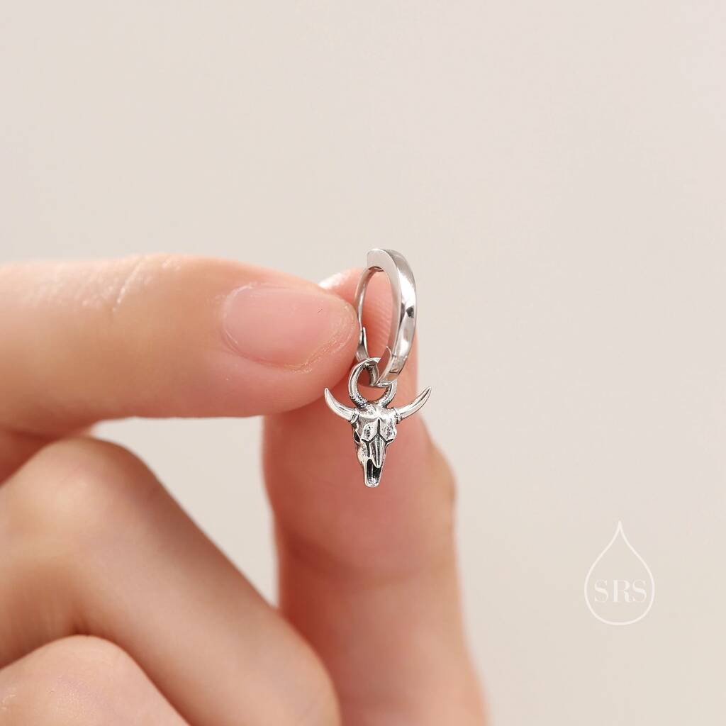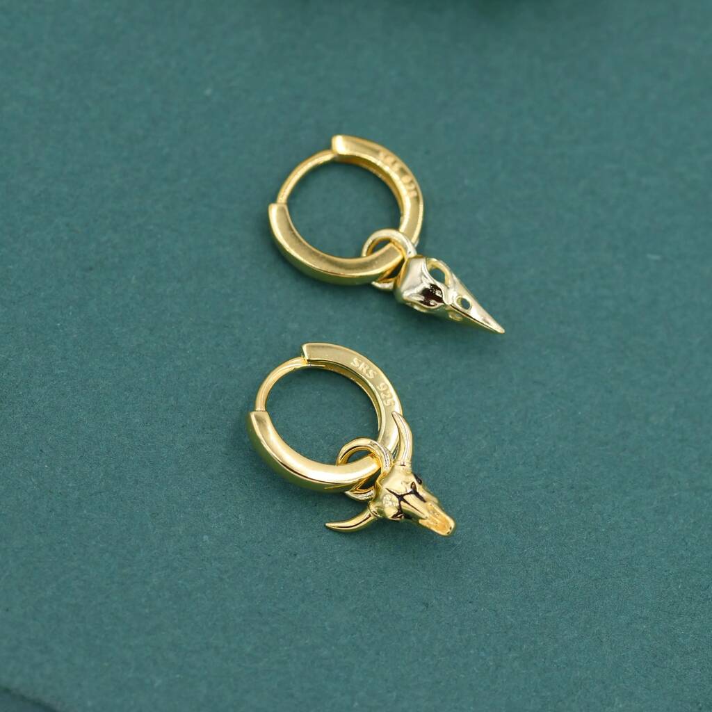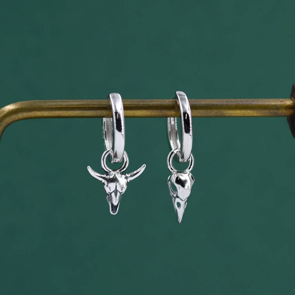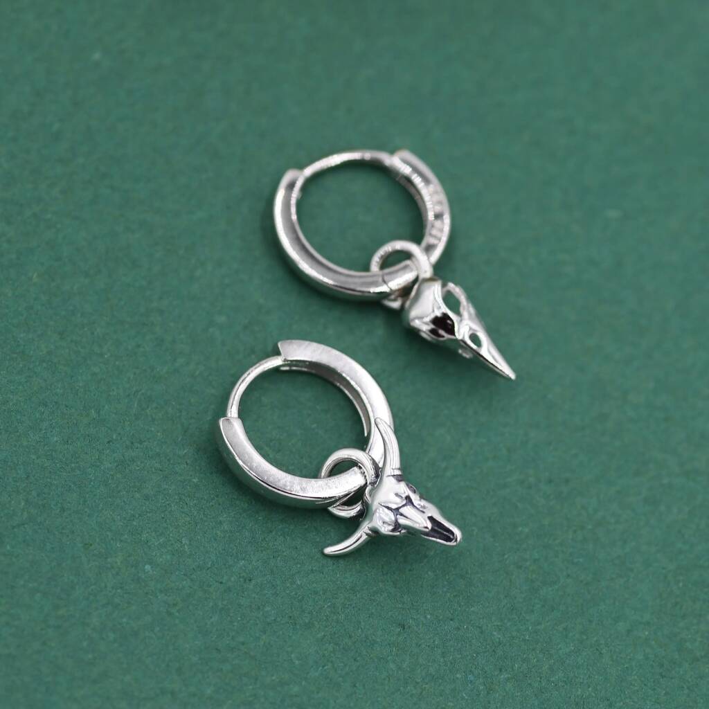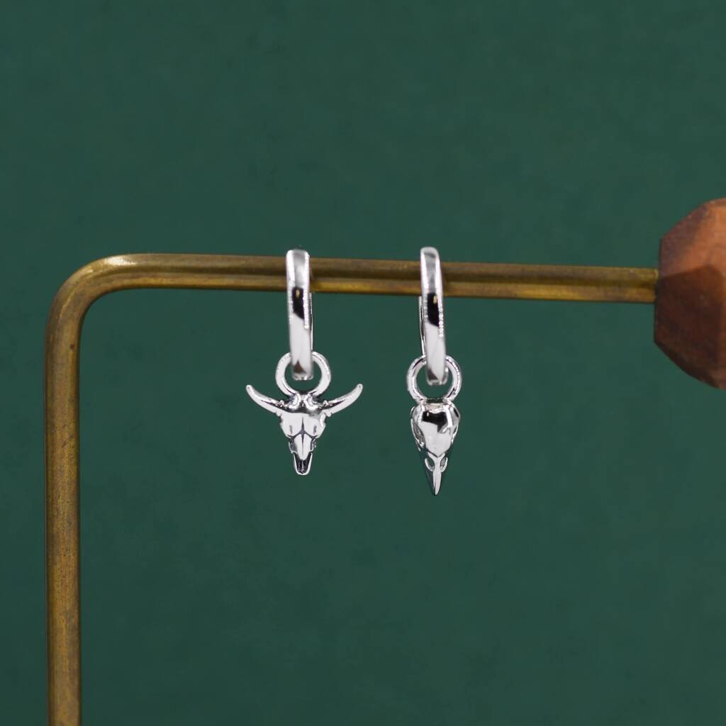 Sterling Silver Mismatched Bull Skull and Bird Skull Hoop Earrings — edgy, gothic-inspired design, blending bold animal motifs for a striking and unique statement accessory.