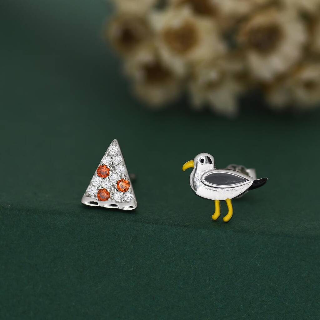Sterling Silver Mismatched Pizza Slice and Seagull Stud Earrings — a quirky, playful pair combining fun food and seaside charm for a unique everyday statement.