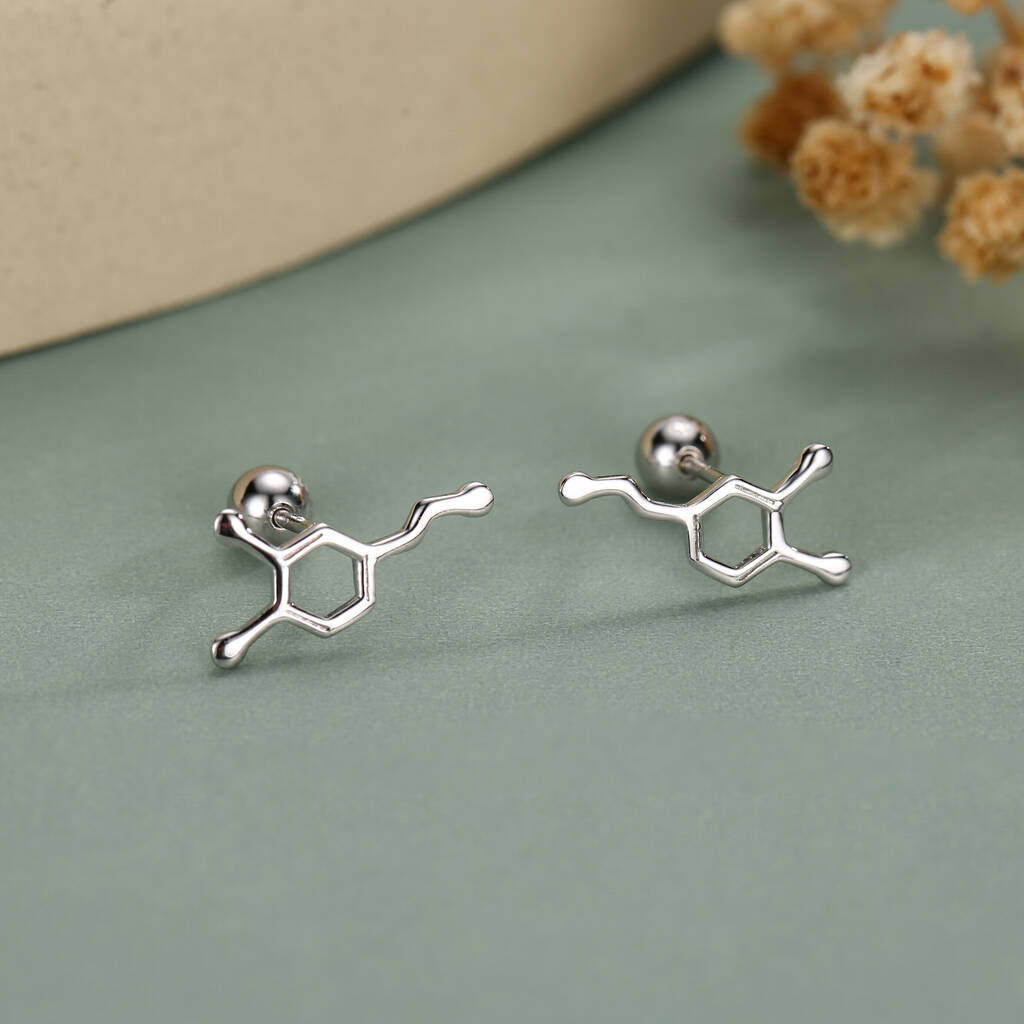 Sterling silver serotonin molecule stud earrings feature 18G screw backs with ball backs, polished detail, secure fit, and playful scientific design for everyday stylish self-expression.