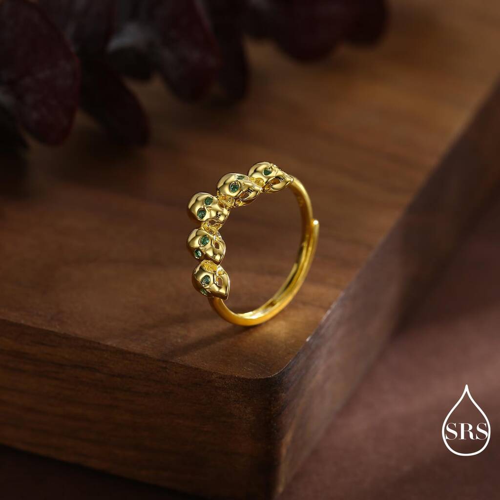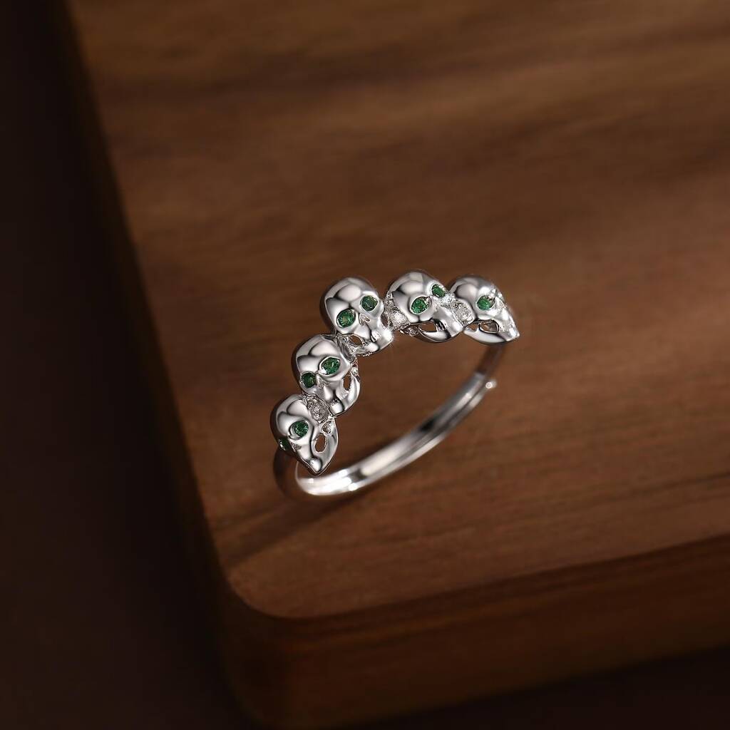 Sterling Silver Skull Motif Ring with Emerald Green CZ — edgy, bold design featuring a striking green stone, adding gothic-charm and statement style to your-look.