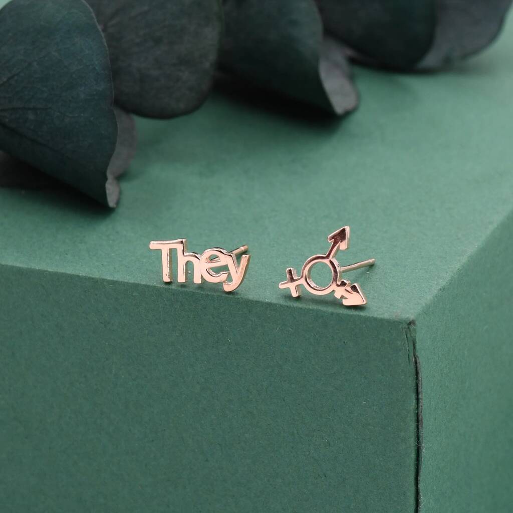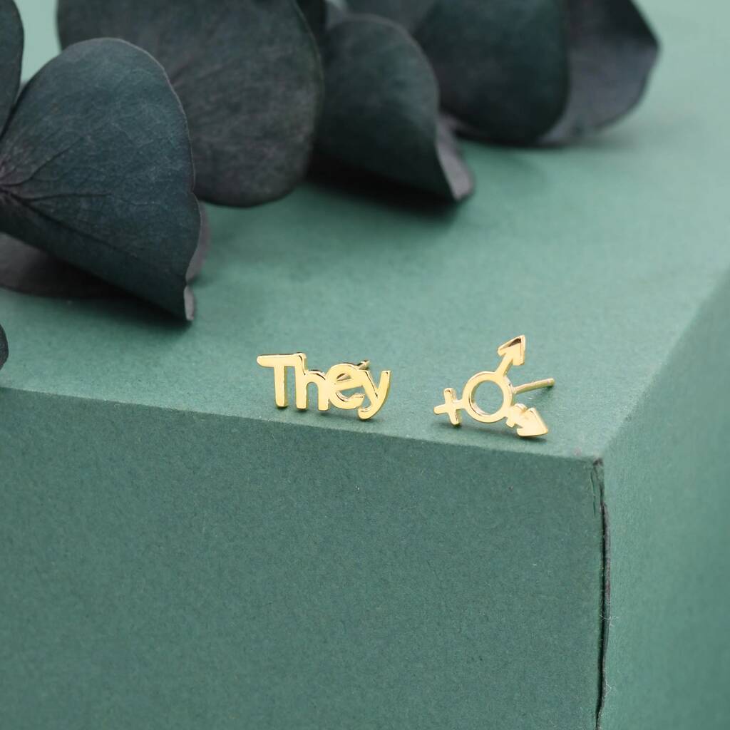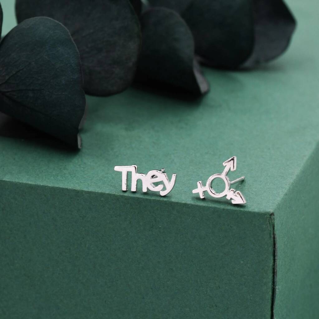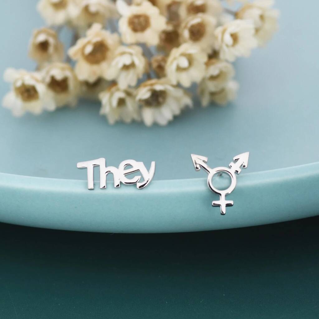 Sterling Silver "They" Pronoun and Transgender Symbol Mismatched Earrings feature empowering, inclusive design, adding meaningful charm and unique style for everyday wear or statement looks.