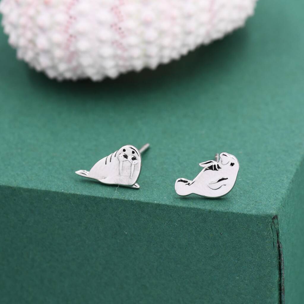 Sterling Silver Walrus & Manatee Mismatched Stud Earrings – quirky ocean-inspired design, bringing playful marine charm to your jewelry collection.
