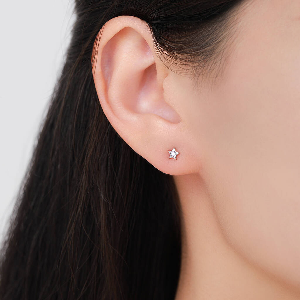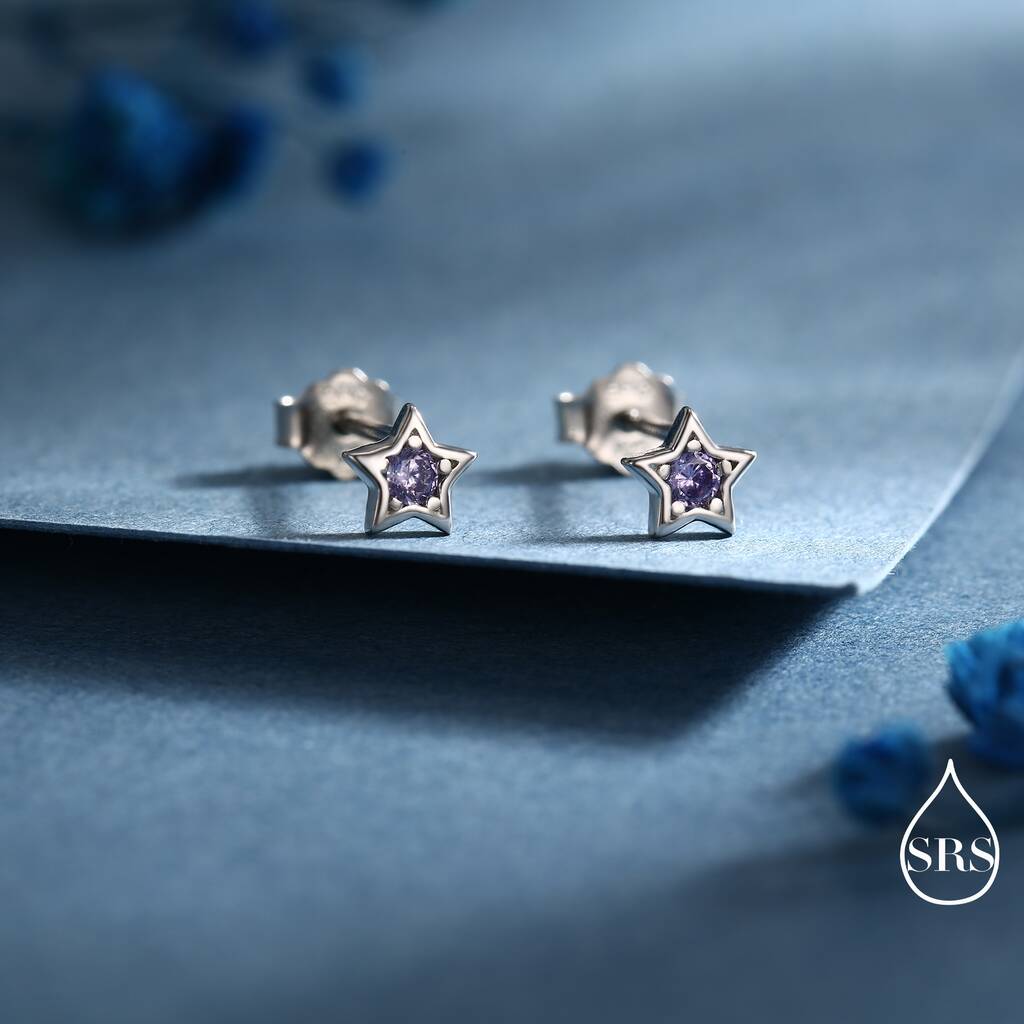Sterling silver studs featuring tiny amethyst purple CZ star designs, adding sparkling elegance, celestial charm, and a subtle, stylish touch to everyday wear or gifting.