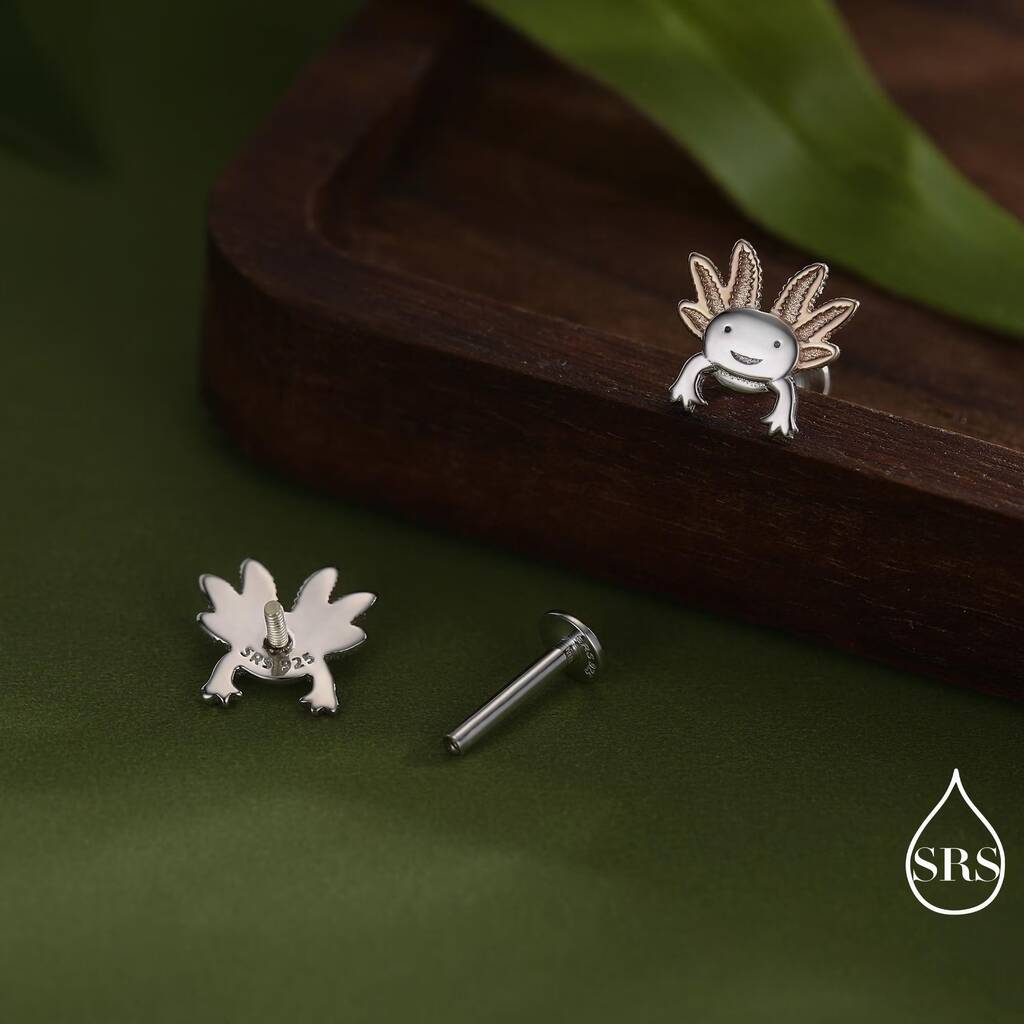 Sterling silver 16G studs featuring tiny axolotl designs with internally threaded flat-backs, adding playful-charm, unique character, and a stylish, quirky-touch to everyday wear or gifting.