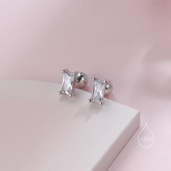 Add a touch of refined elegance with our Baguette CZ Screwback Earrings in Sterling Silver, perfect for a secure and sophisticated accent to any outfit.