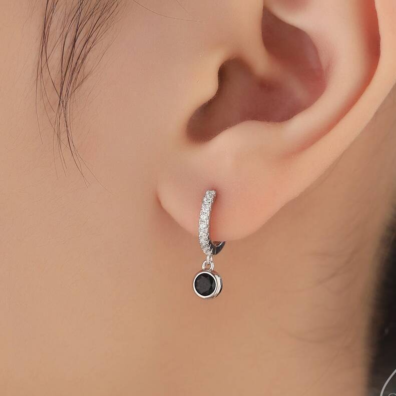 Tiny Black Cz Dangle Huggie Hoop In Sterling Silver