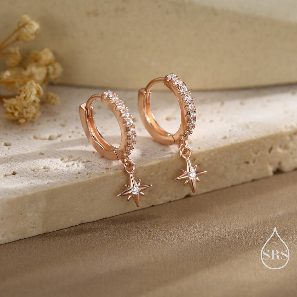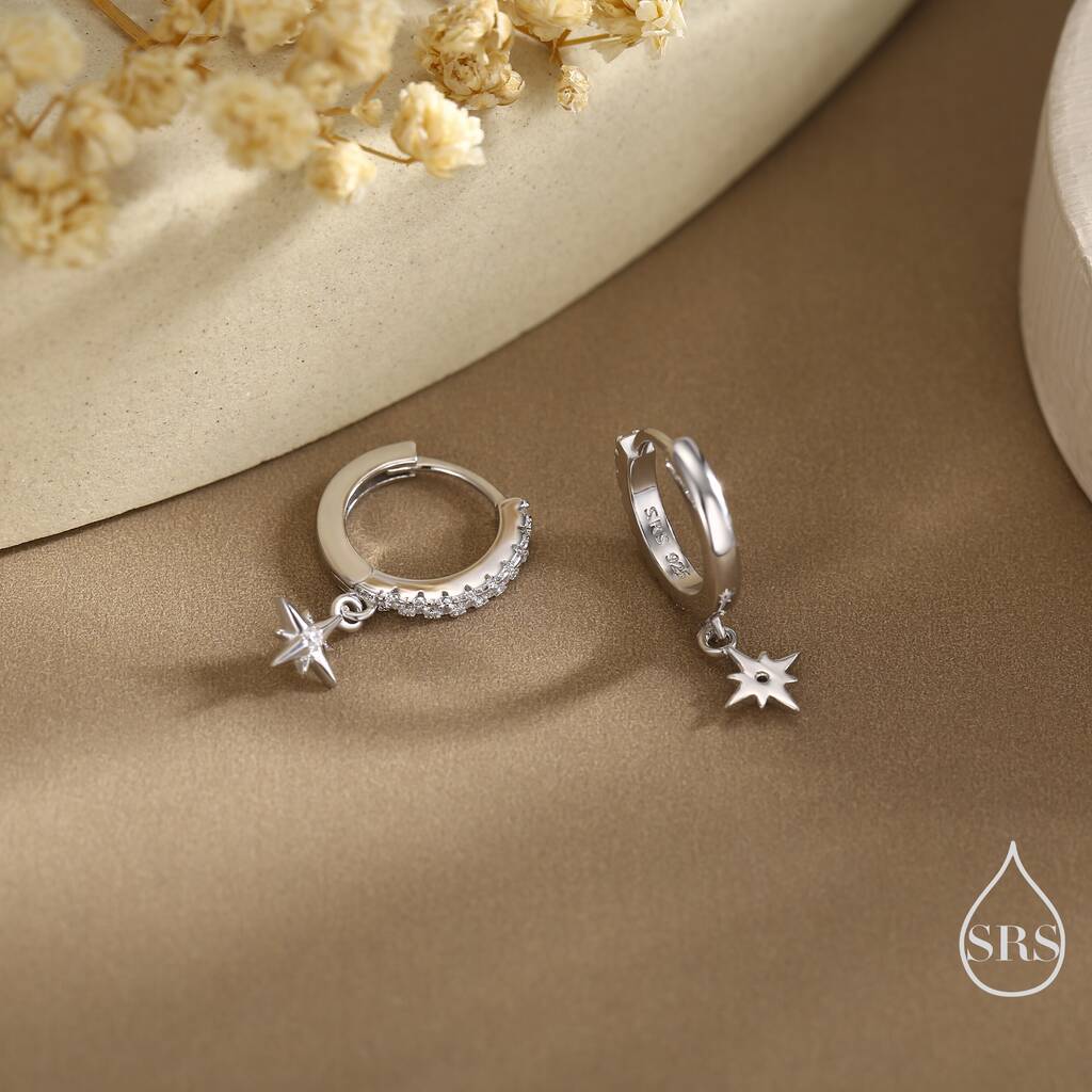 Chic tiny CZ starburst huggie hoop earrings in sterling-silver. Radiate with celestial elegance. Perfect for adding a touch of cosmic charm or gifting celestial allure.