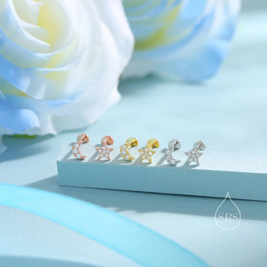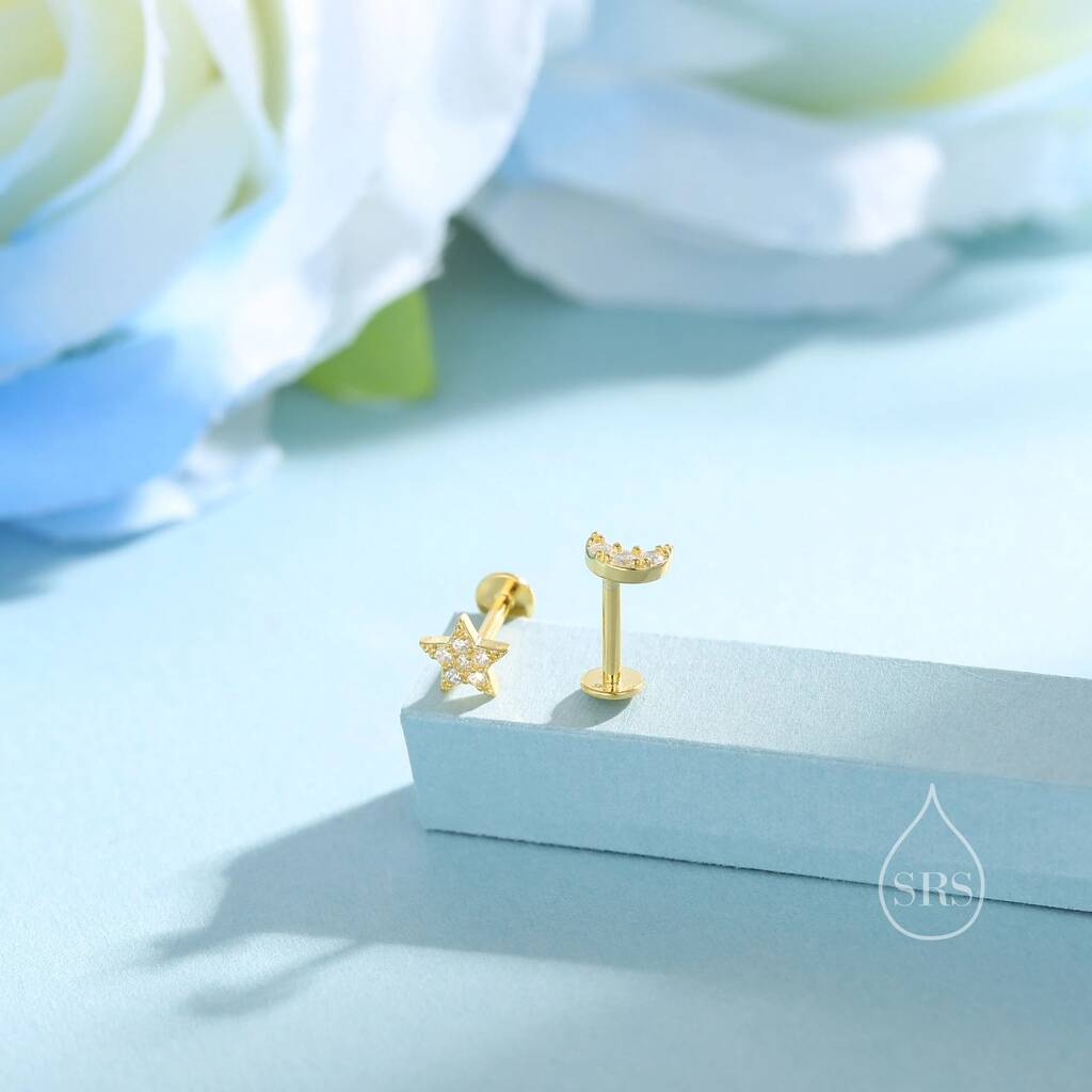 Tiny Mismatched Moon And Star Internally Threaded Flat Back Earrings In Sterling Silver