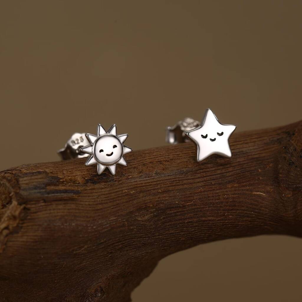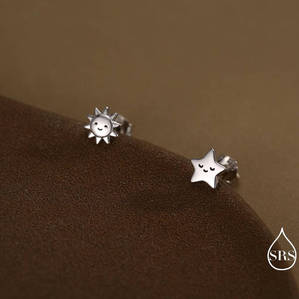 Sterling silver studs featuring tiny mismatched sun and star designs, adding celestial charm, subtle sparkle, and a unique, stylish touch to everyday-wear or thoughtful gifting.