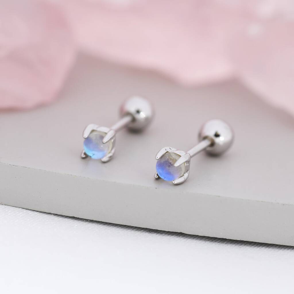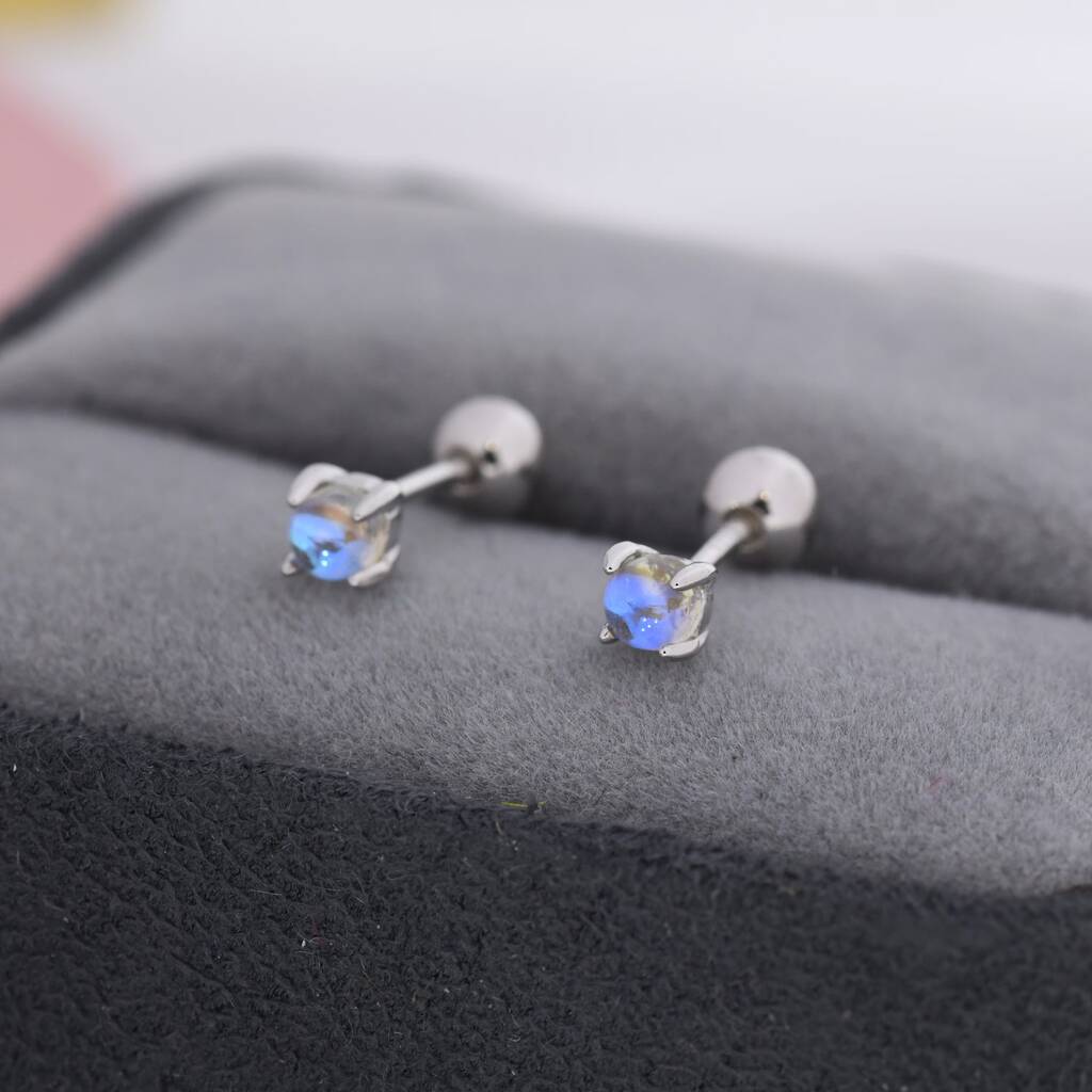 Tiny Moonstone Screw Back Earrings in Sterling Silver — secure studs featuring luminous moonstone, adding subtle celestial-charm and elegant sparkle for everyday-wear or special occasions.