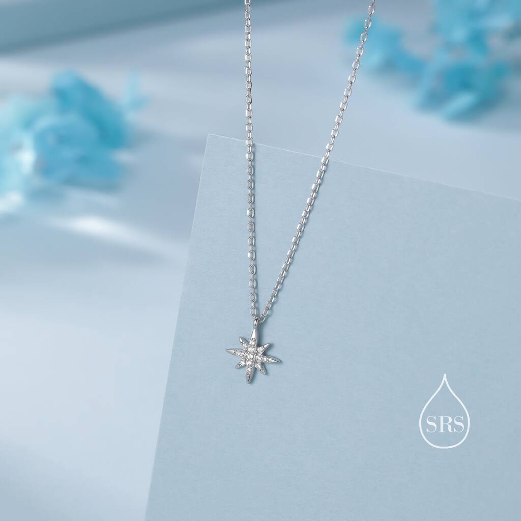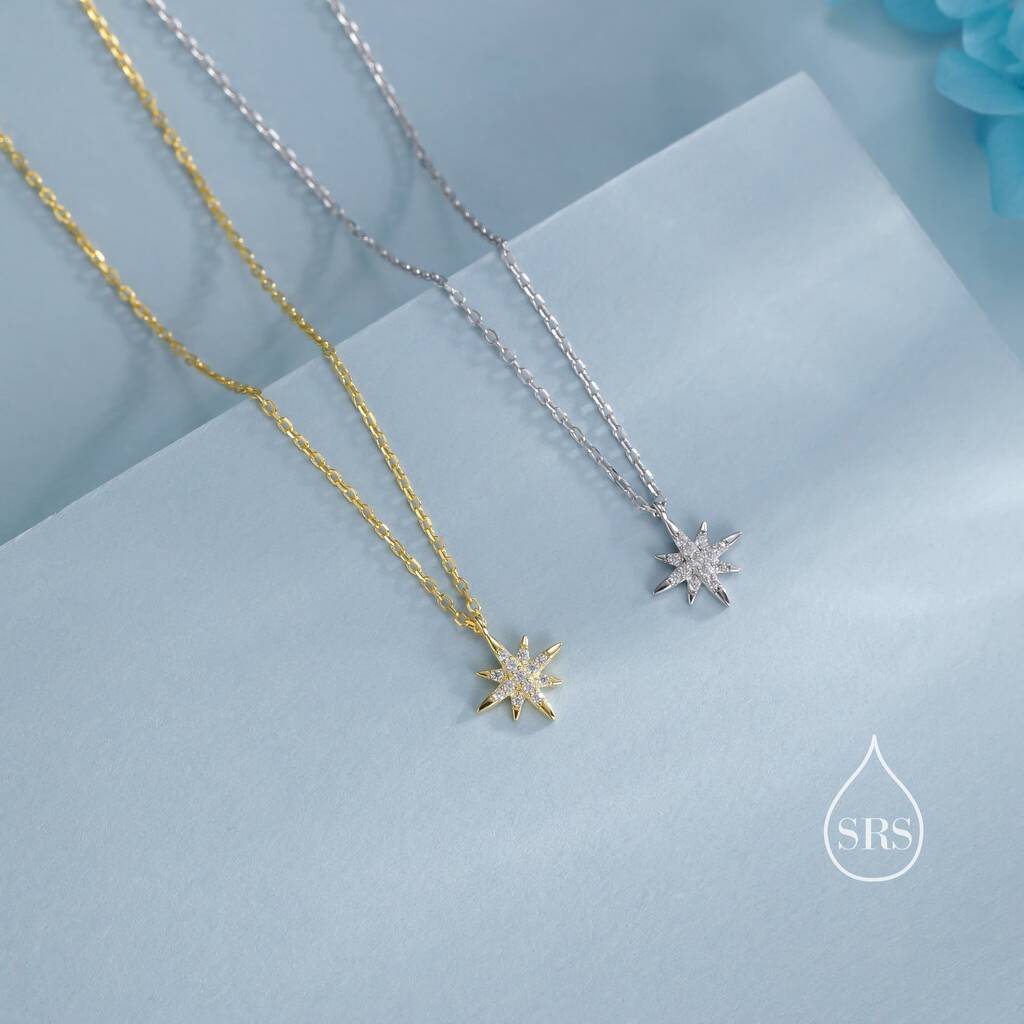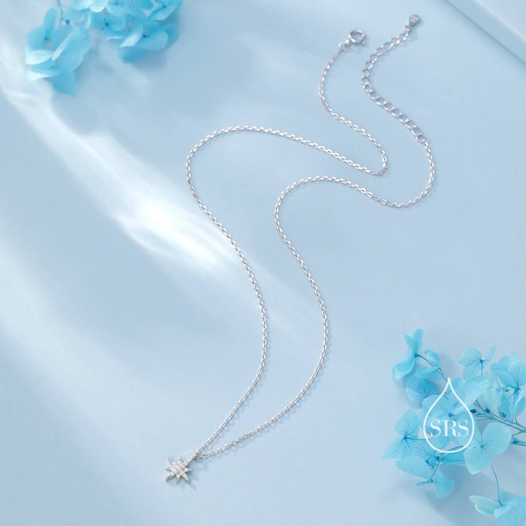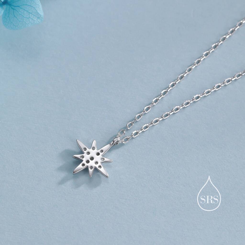 Elegant tiny starburst pendant necklace in sterling-silver. Illuminate with celestial-charm. Ideal for adding a touch of cosmic elegance to your style or gifting celestial allure.