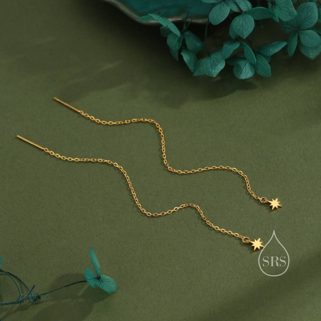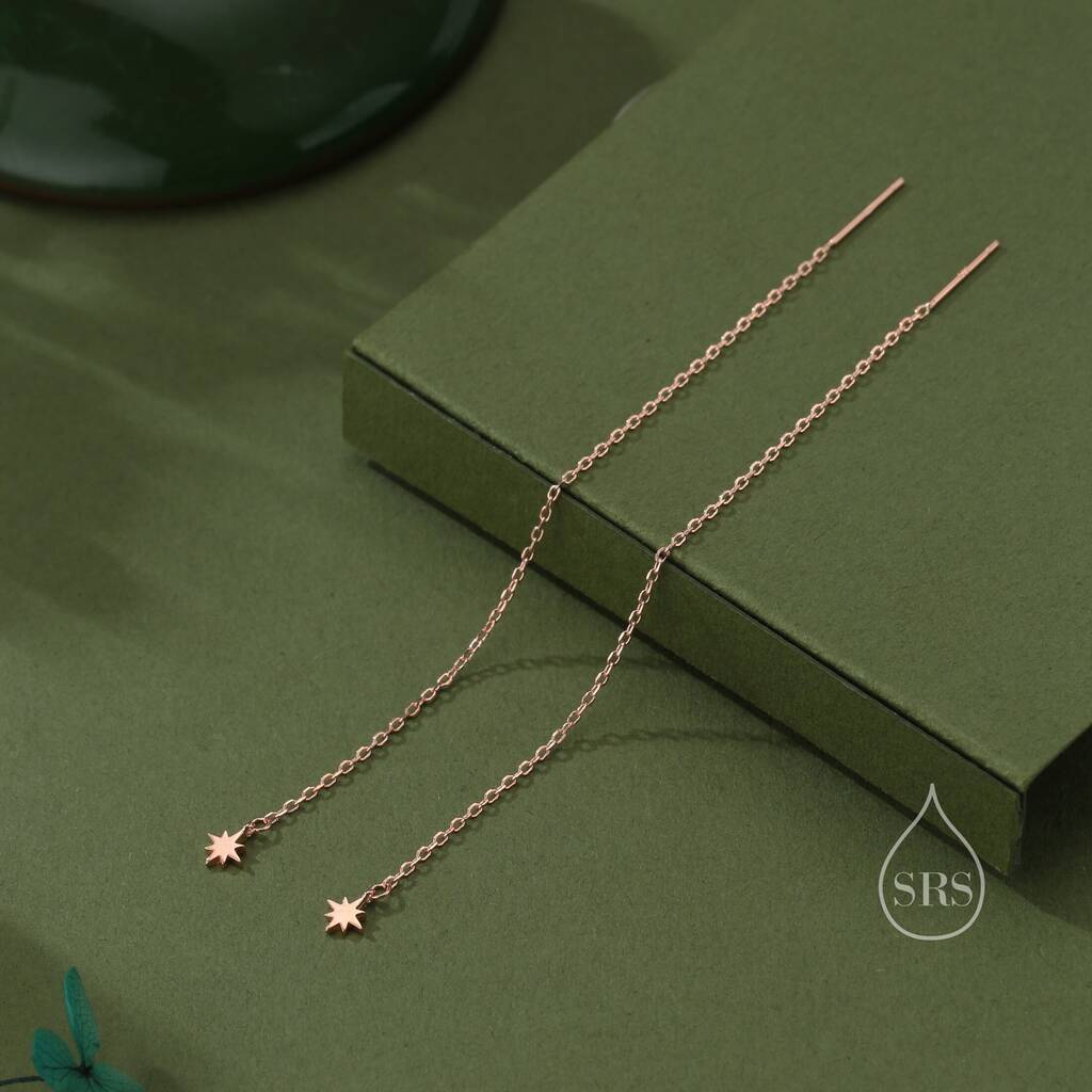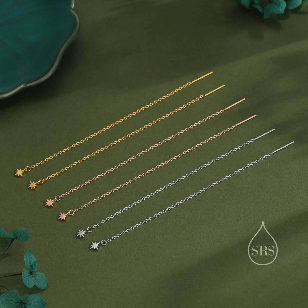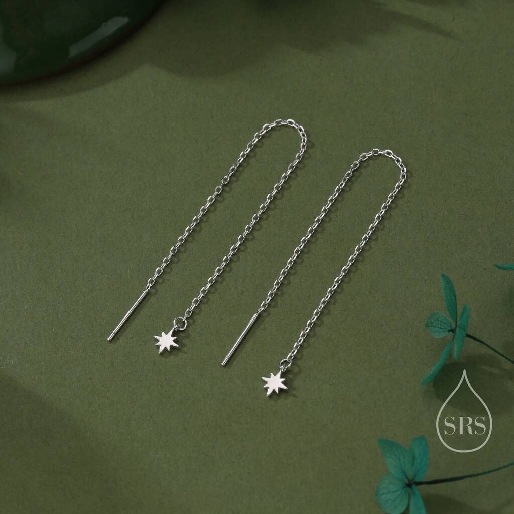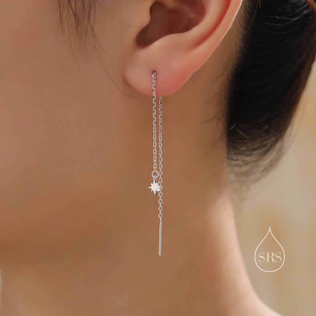 Chic tiny starburst threader earrings in sterling-silver. Blend celestial style with modern simplicity. Perfect for adding a touch of enchantment daily or gifting cosmic charm.