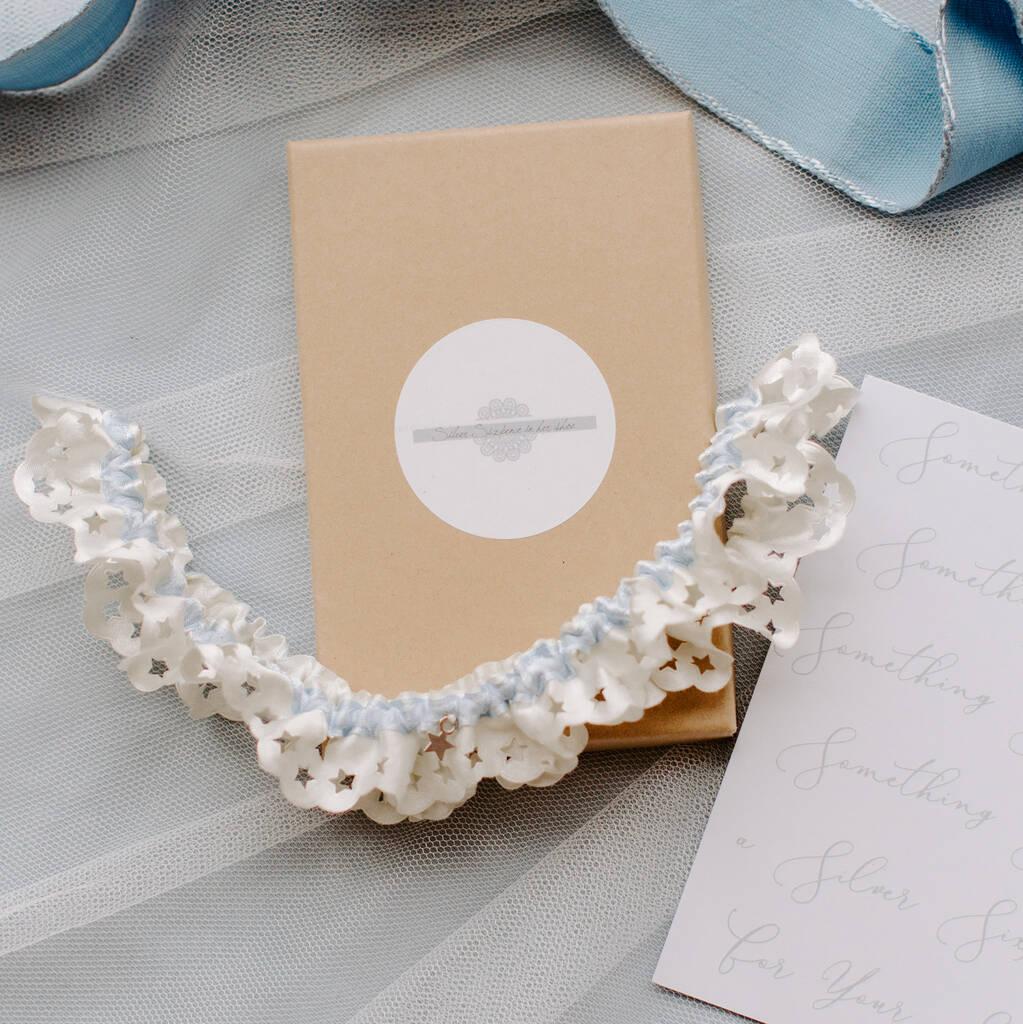 A delicate ivory satin garter with cut out star design and a blue ribbon trim. The box can be personalised with recipient's name or message