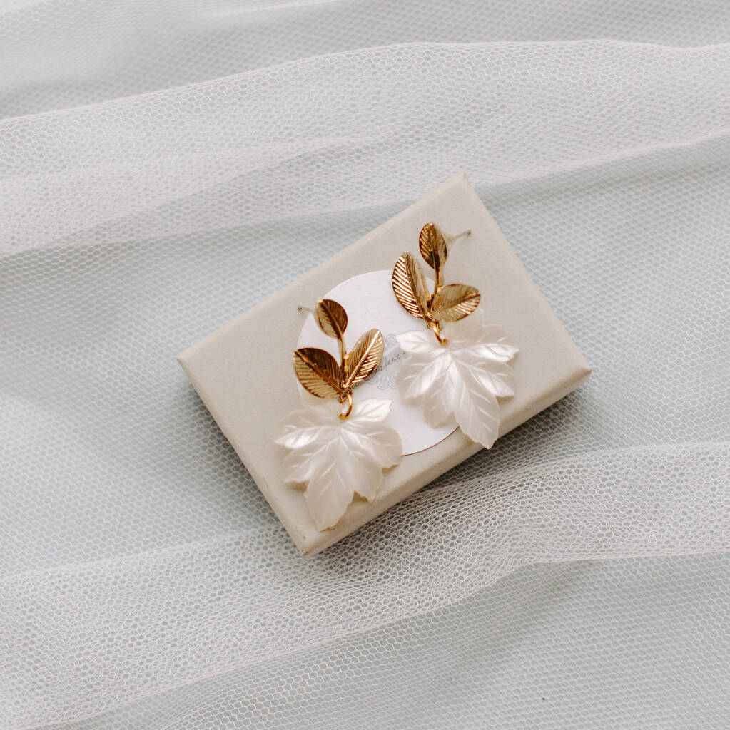 A pair of carved gold and ivory carved leaf dropper earrings perfect for a bride or bridesmaid