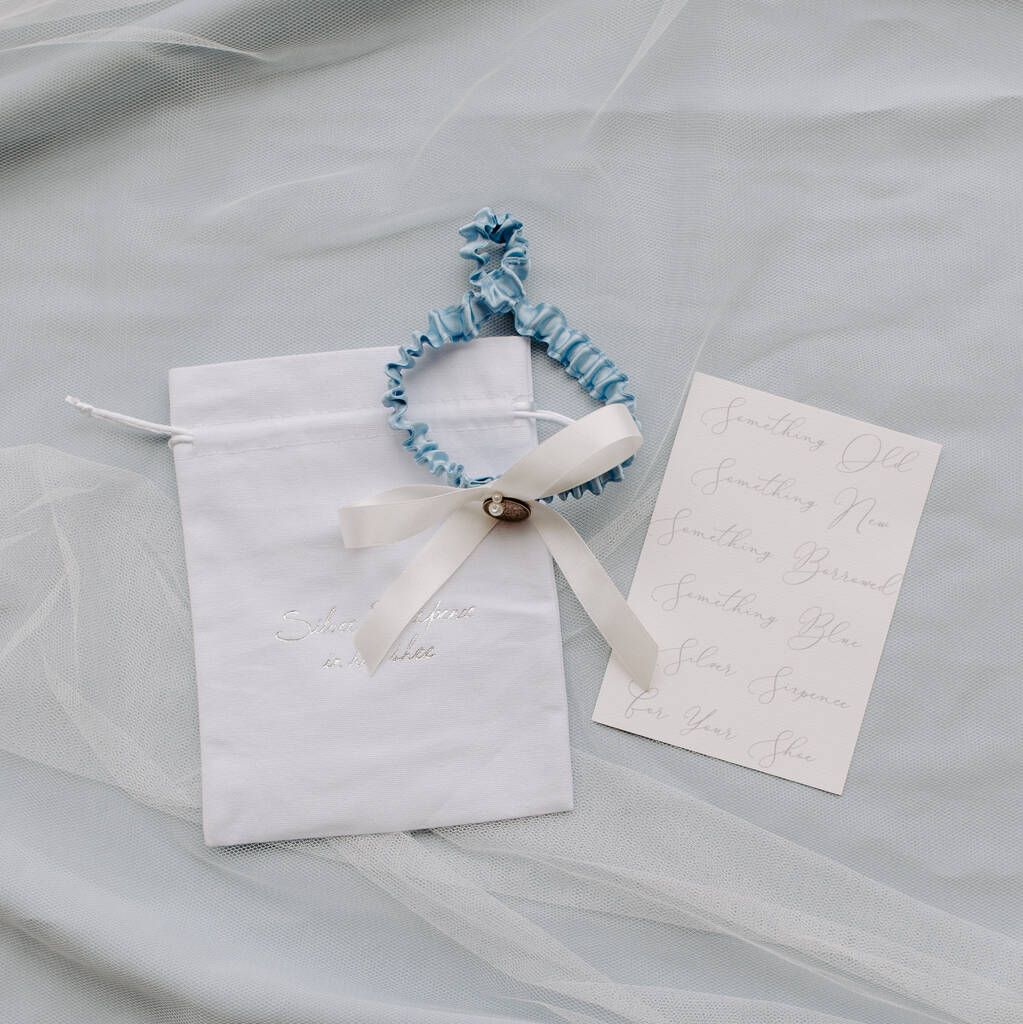 A simple, elegant wedding garter that can be personalised in a mid blue satin band style with a delicate ivory bow and lucky silver sixpence