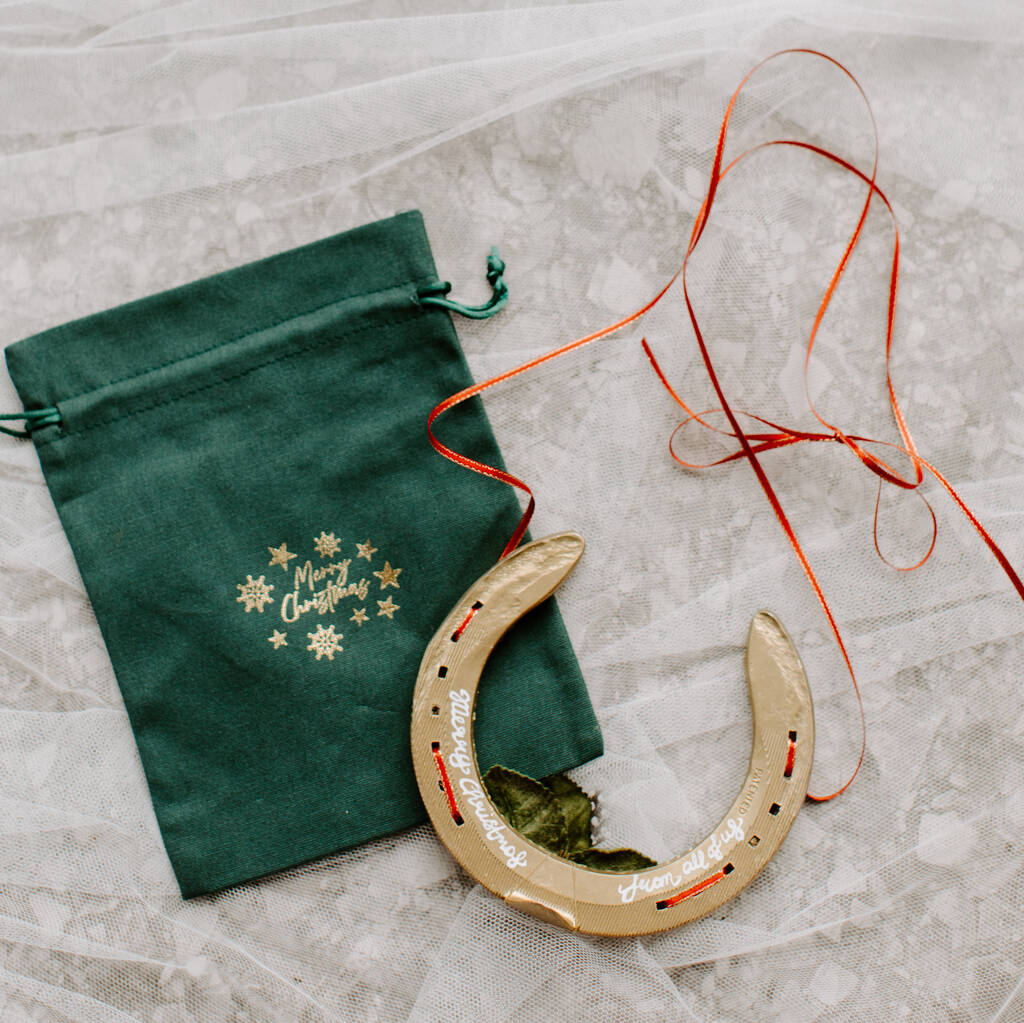 A real horseshoe in gold with a seasonal, festive ribbon bow. This can be personalised with names and dates for the perfect wedding gift.