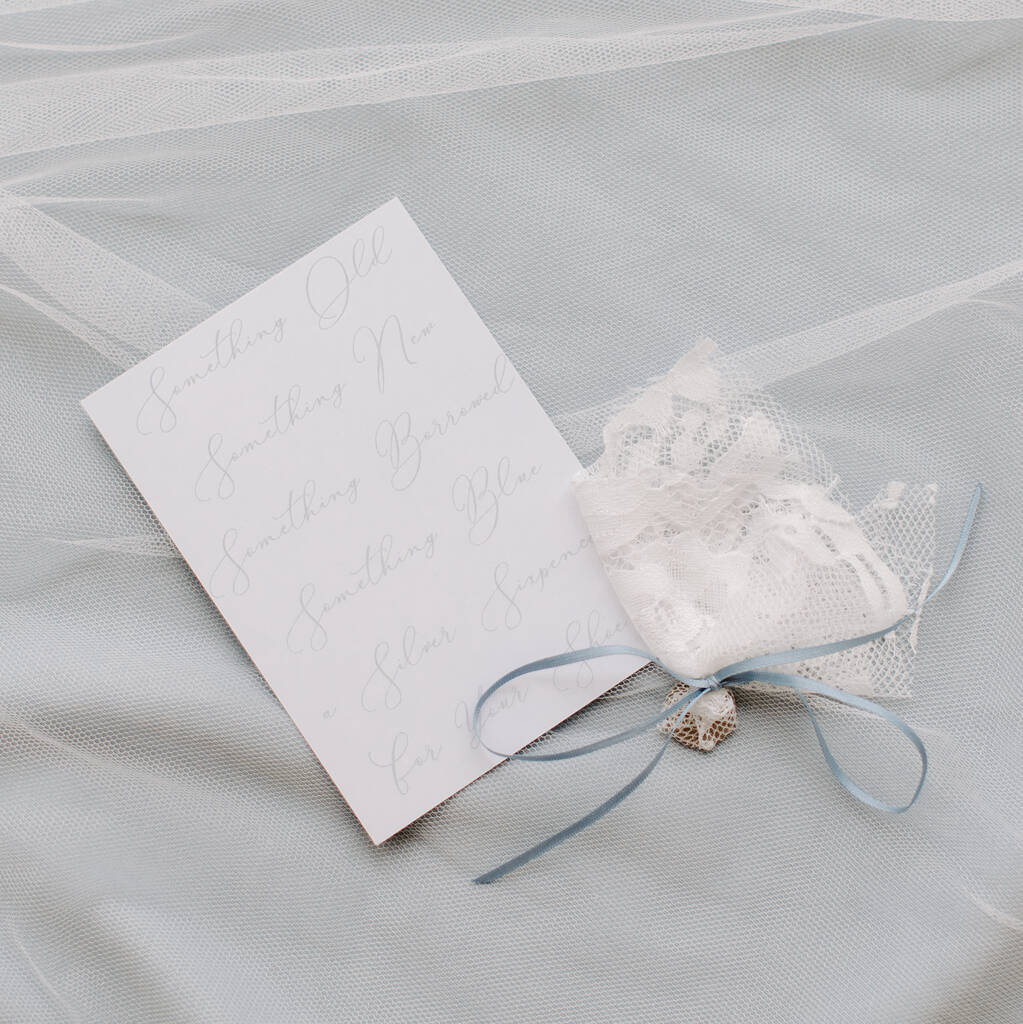 A thoughtful gift set for the bride of a personalised "something blue" real lucky wedding horseshoe, garter, real silver sixpence and a calligraphy rhyme card