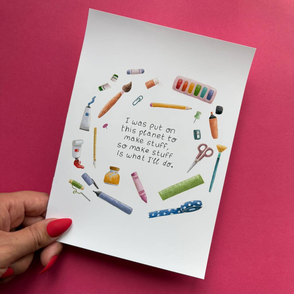 This art print is a little reminder for makers everywhere: “I was put on this planet to make stuff, so make stuff is what I’ll do.” Surrounded by illustrated paintbrushes, pencils, tape, and paints.