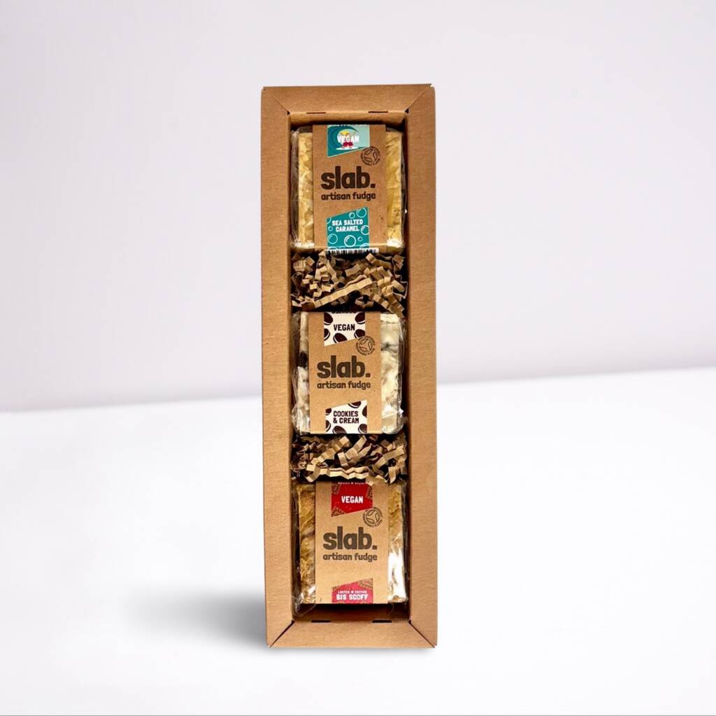 Our 3 best-selling vegan flavours all in one box!The Slab Bestsellers Selection Box contains our 3 most popular vegan fudge flavours - Sea-Salted Caramel, Bis Scoff and Cookies & Cream. They’re popular for a reason! All freshly made and wrapped by hand, as always. The perfect gift for someone who’s got everything!