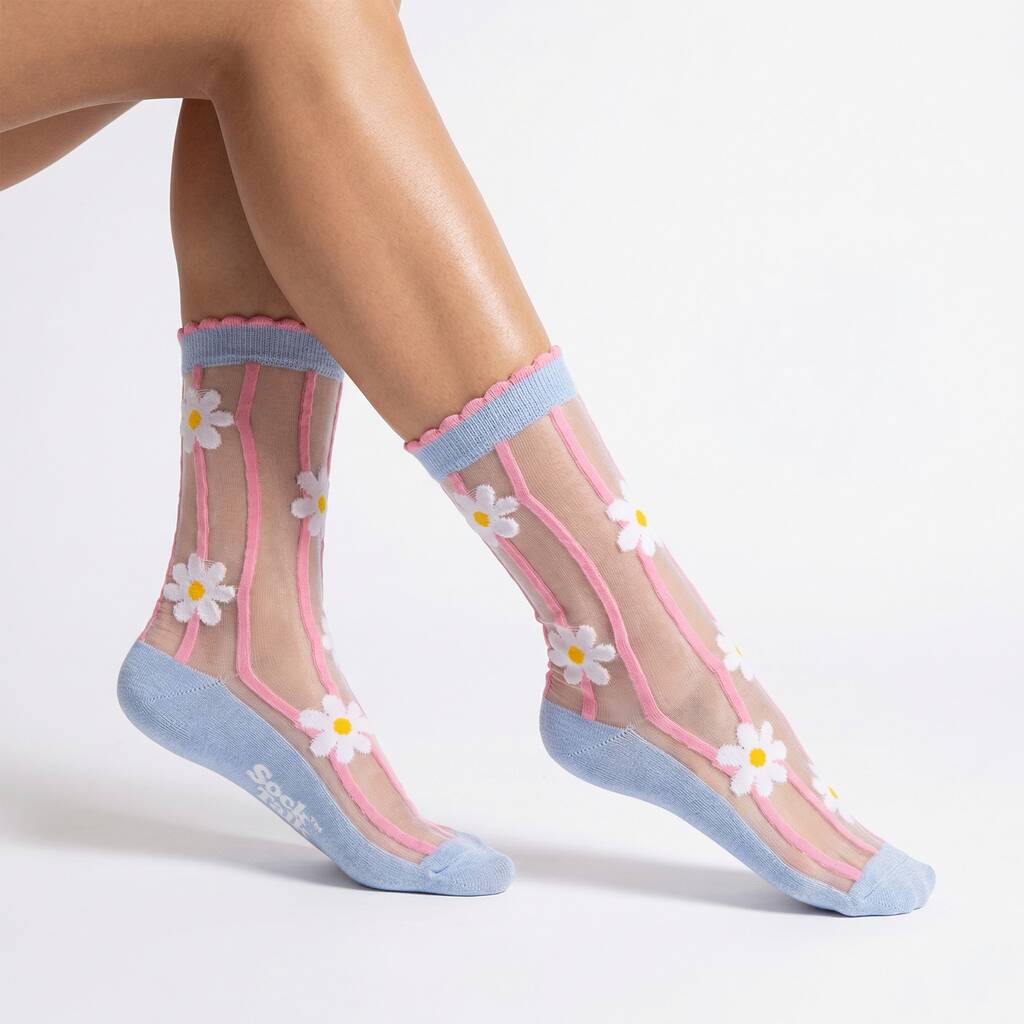 Daisy Stripes Combed Cotton Sheer Pop Socks In Blue/Pink