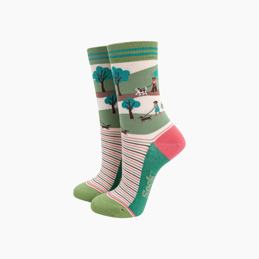 Dog Walking Striped Bamboo Socks In Green