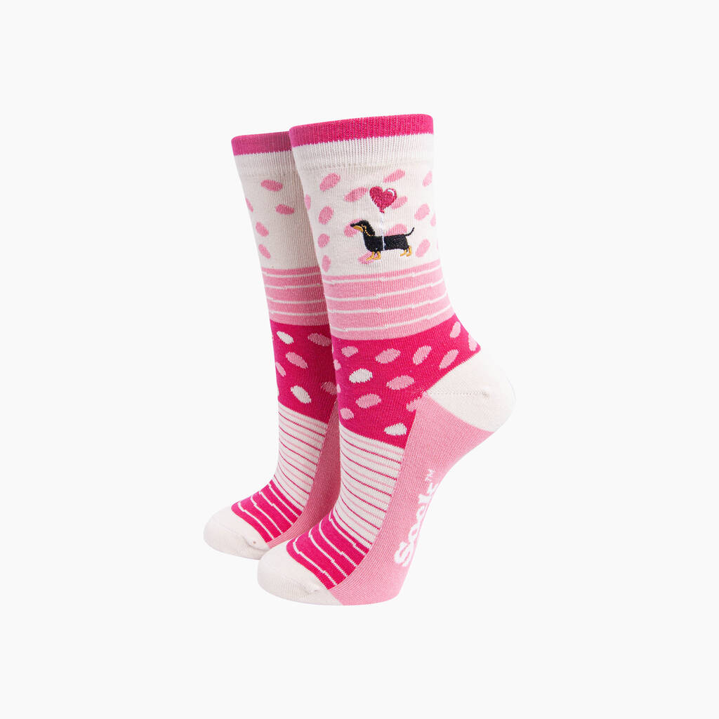 Embroidered Sausage Dog Heart Balloon Combed Cotton Socks In Pink