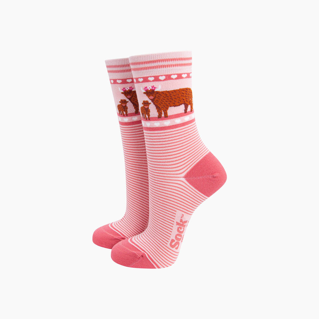 Highland Cow Calf Striped Bamboo Socks In Pink