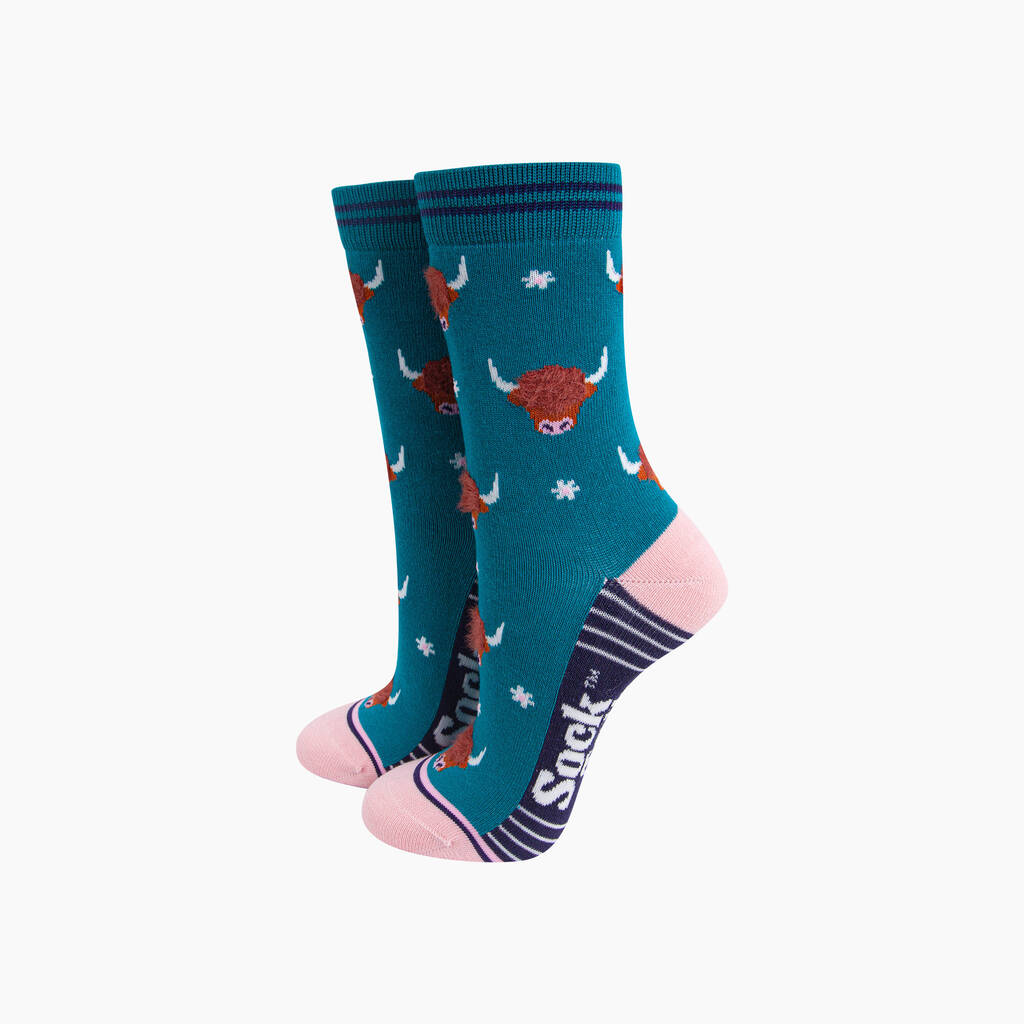 Highland Cow Floral Fluffy Bamboo Socks In Teal