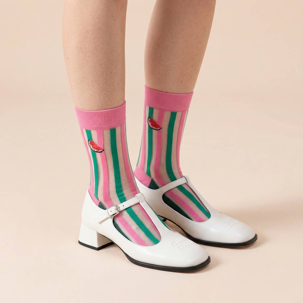 Watermelon Stripes Combed Cotton Sheer Pop Socks In Pink