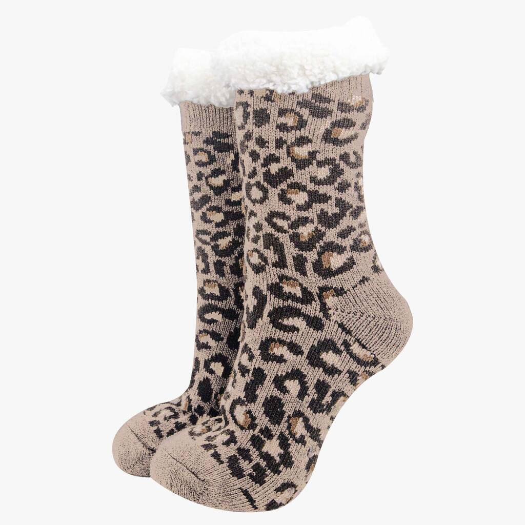 Women's Long Slipper Socks Grip Sole Leoaprd Print Neutral