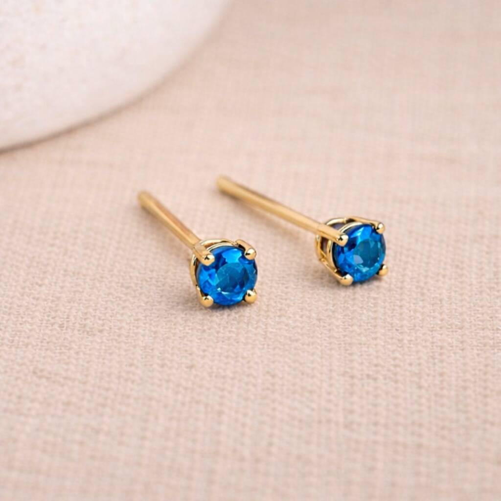Handcrafted December birthstone stud earrings made from solid 375 9ct yellow gold and set with genuine blue topaz gemstones