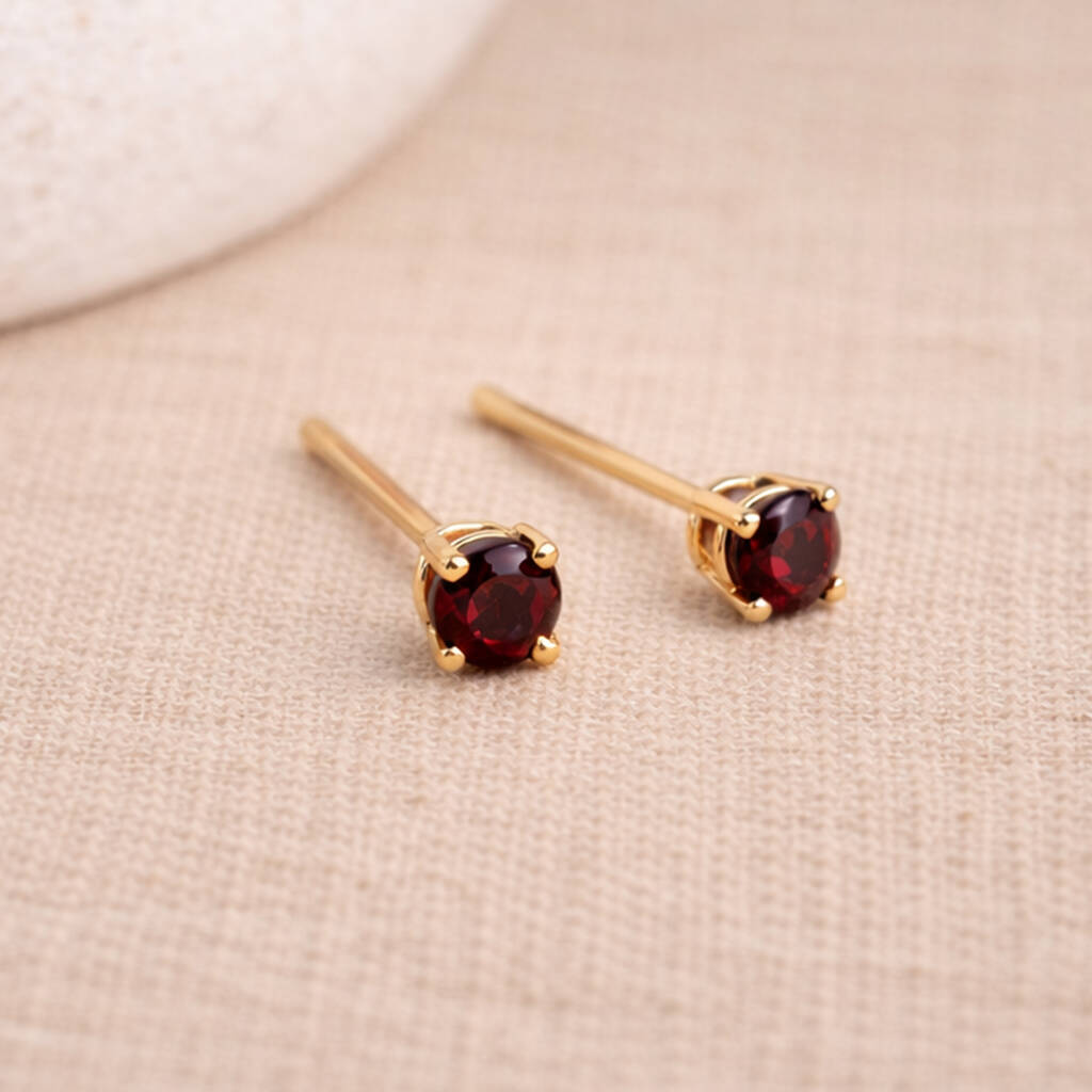 These garnet stud earrings are crafted from solid 9ct yellow gold and set with genuine deep red garnet gemstones, creating a classic and elegant gold and red finish. Designed in a timeless round solitaire style, each 4.00mm stone is securely held in a traditional claw setting to maximise light and enhance the natural depth of colour.