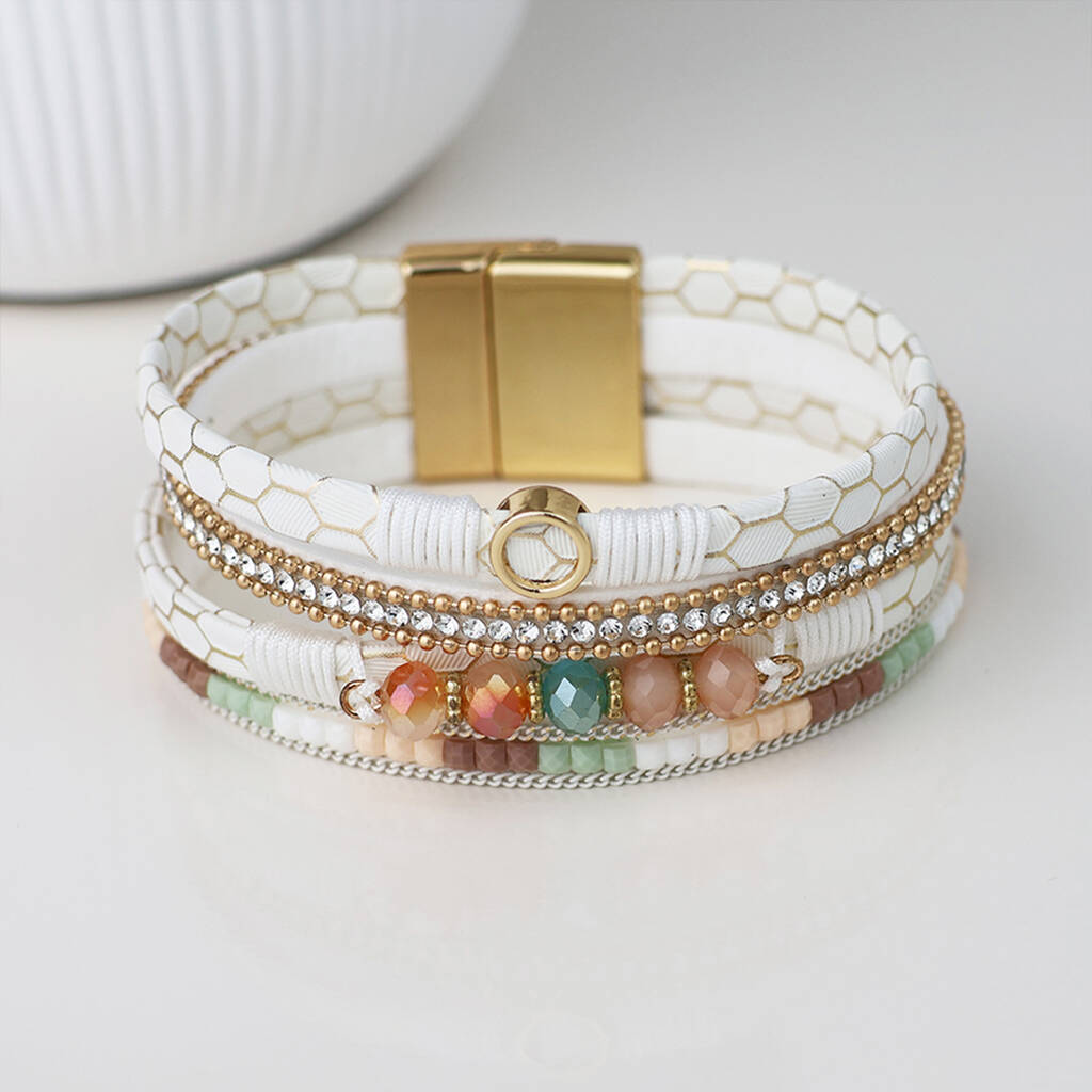 Perfect as a gold multi strand bracelet, pastel beaded leather bracelet, statement cuff style accessory, or eye catching summer wristwear, this piece adds colour and sparkle to both casual and dressy outfits.