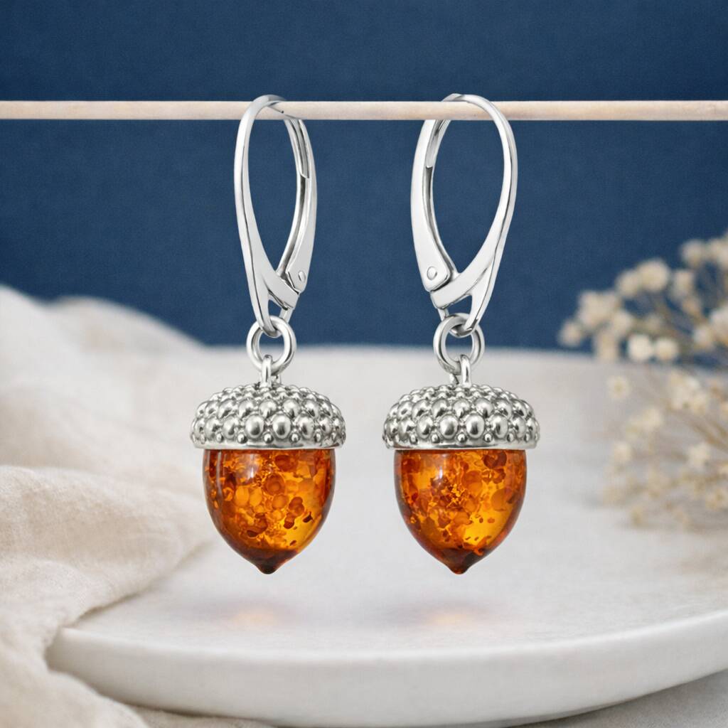 Large Sterling Silver Baltic Amber Acorn Drop Earrings