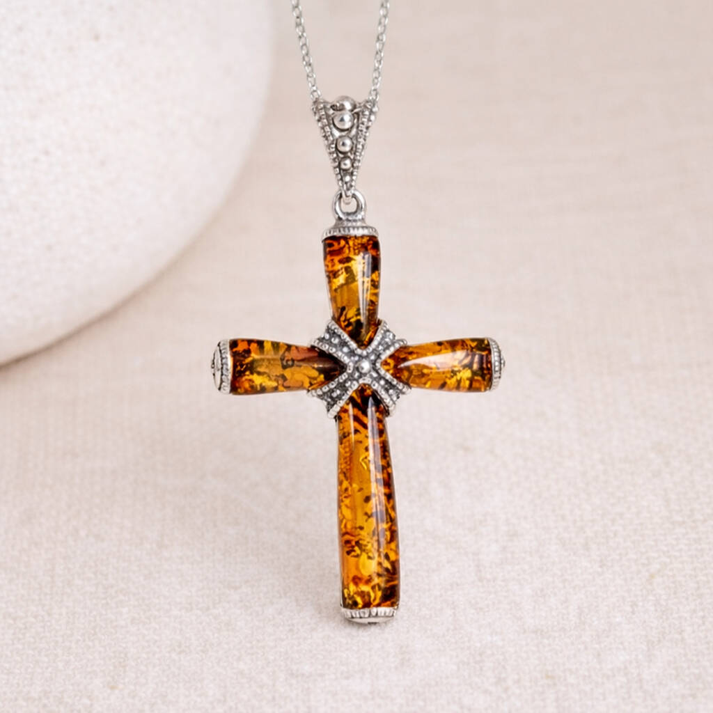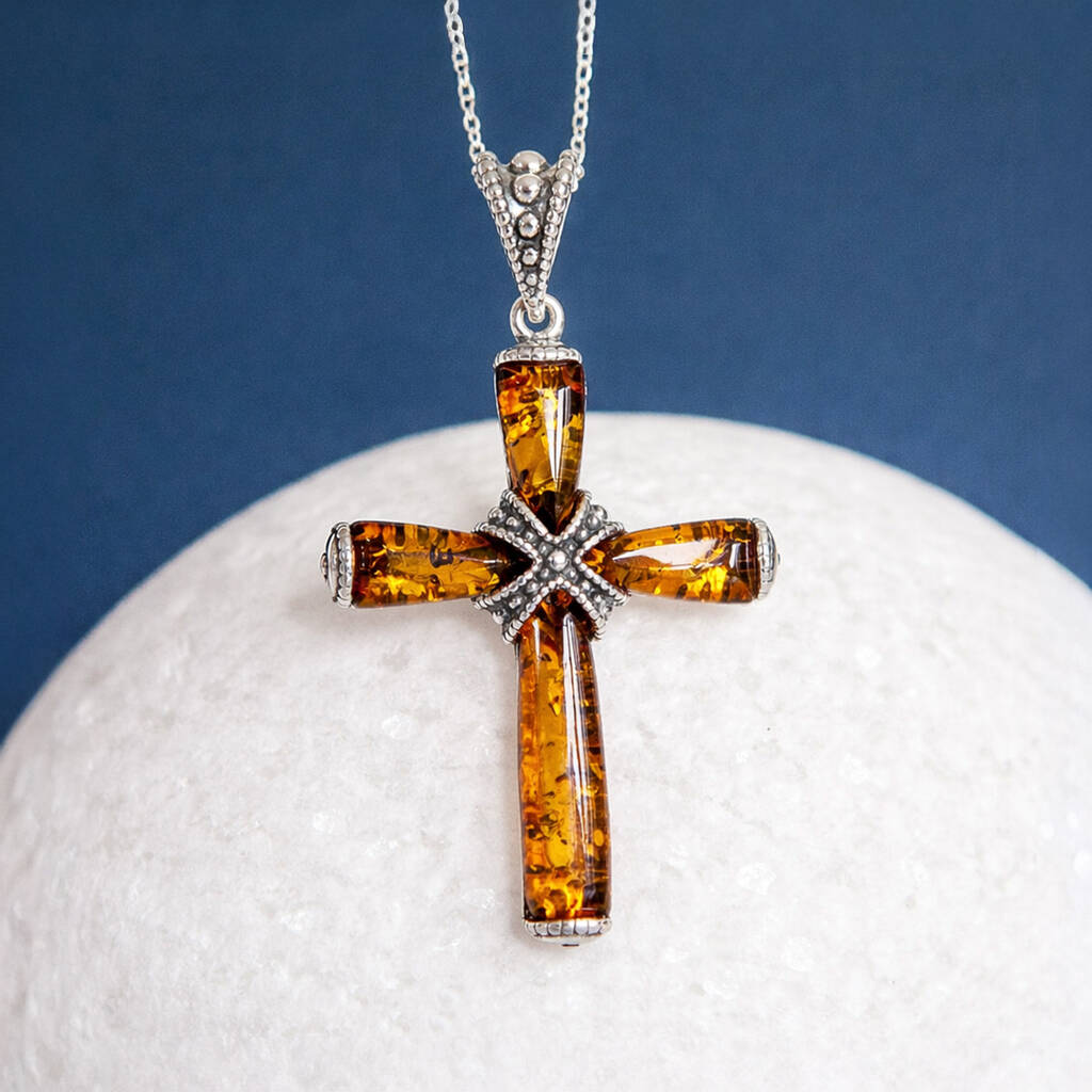 This handcrafted cross pendant is made from solid 925 sterling silver and set with genuine Baltic amber, creating a timeless piece with meaning and warmth.