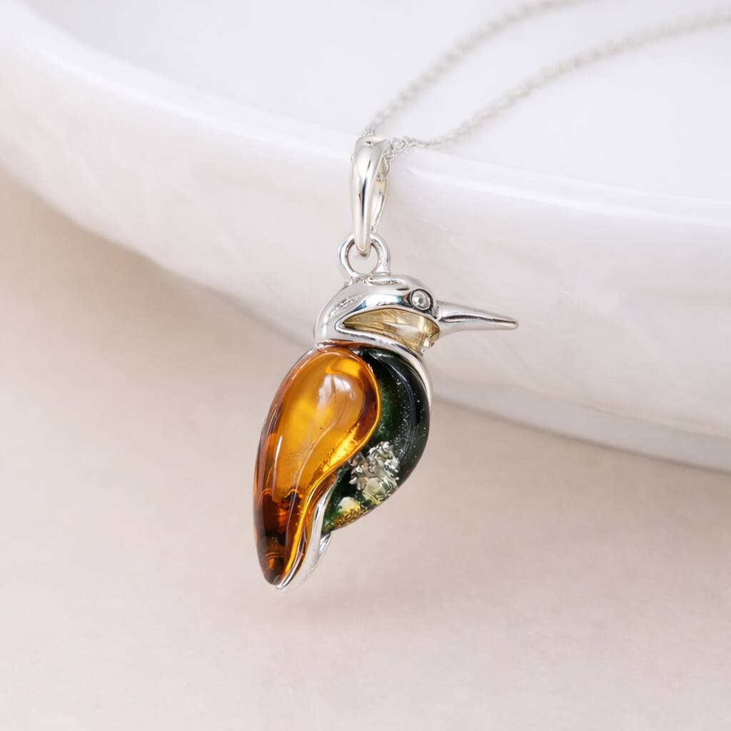 This handcrafted kingfisher pendant is made from solid 925 sterling silver and set with genuine Baltic amber, creating a striking and timeless piece inspired by wildlife.