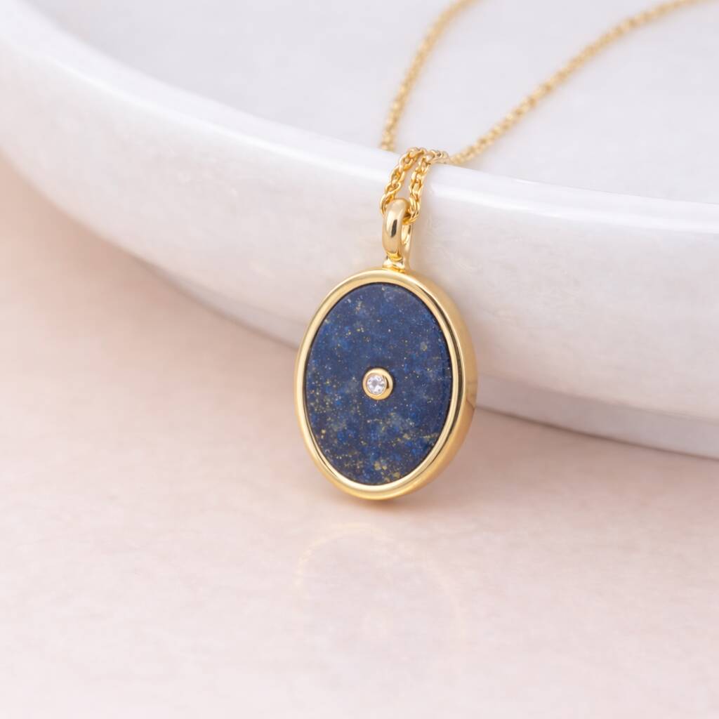 An oval-shaped yellow gold-plated sterling silver keepsake locket with a natural Lapis gemstone. Space on the back for a personal message and one photo inside.