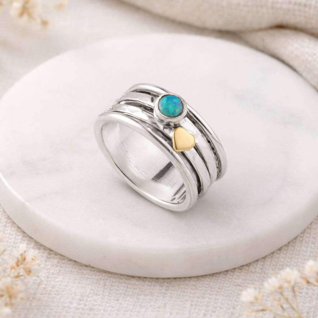 Handcrafted gold heart spinner ring made from solid 925 sterling silver with spinning bands of silver and set with a blue opal gemstone