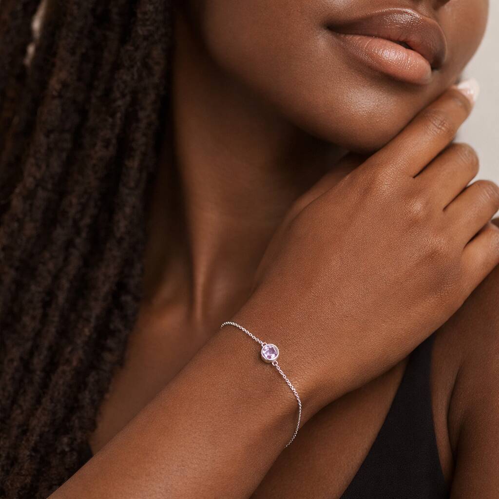 This lilac cubic zirconia offers a gentle lavender tone that symbolises creativity, intuition, and calm. Shades can range from pale pastel lilac to a slightly deeper soft violet depending on the light. The faceted cut reflects light beautifully, giving the bracelet a refined sparkle while maintaining an elegant, minimalist look. June is traditionally associated with pearl, moonstone, and alexandrite, and this lilac tone provides a modern, romantic interpretation of the month’s birthstone palette.