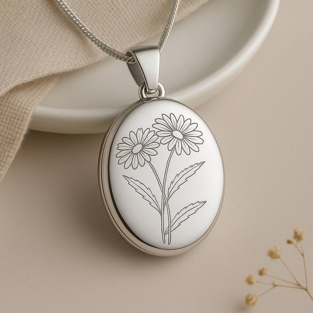 This beautiful oval locket is crafted from solid 925 sterling silver and engraved with a delicate daisy motif, the birth flower for April. Symbolising purity, innocence, and new beginnings, the daisy makes this locket a meaningful keepsake for April birthdays or special milestones.