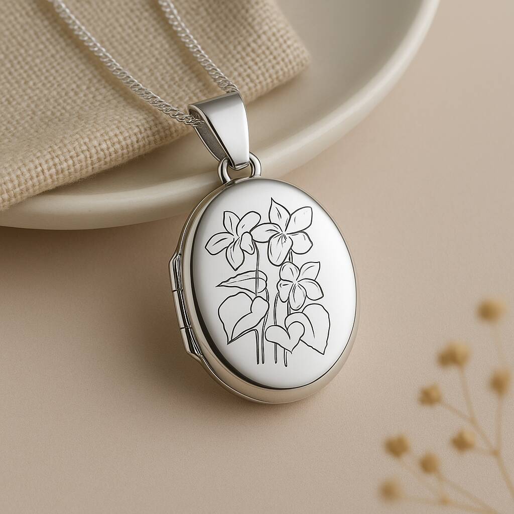 This elegant oval locket is crafted from solid 925 sterling silver and beautifully engraved with a violet motif, the birth flower for February. Symbolising faithfulness, wisdom, and everlasting love, the violet makes this locket a meaningful keepsake for February birthdays or special milestones.