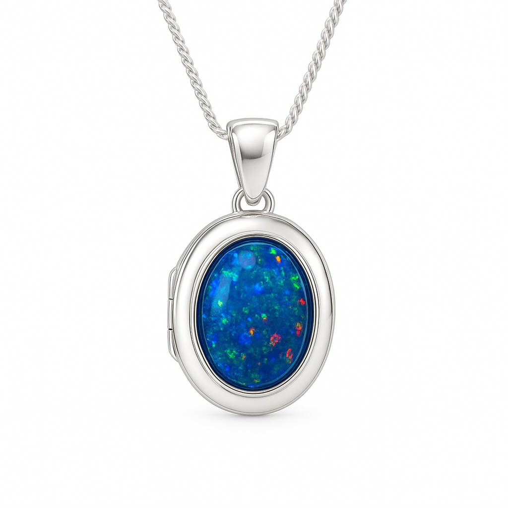 An oval-shaped solid sterling silver and opal triplet gemstone keepsake locket with space for a personal message on the back and two photos inside.