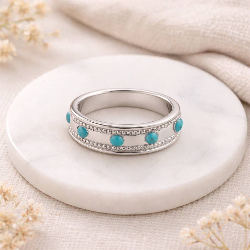 Made using solid 925 sterling silver, this ring is carefully shaped and polished to create a comfortable 5.5mm wide band. Small turquoise stones are set into the design, adding gentle colour and a sense of individuality while keeping the overall look clean and wearable.