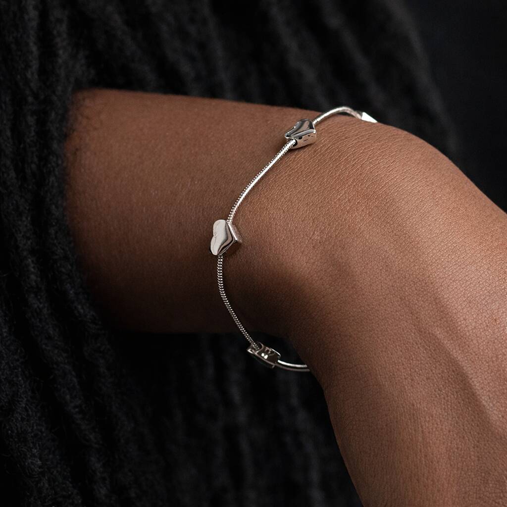 ♡ Style Tip: Wear this bracelet slightly fitted so the heart charms sit neatly along the top of the wrist, and pair with a slim silver bangle or delicate chain bracelet for a layered, elegant look.