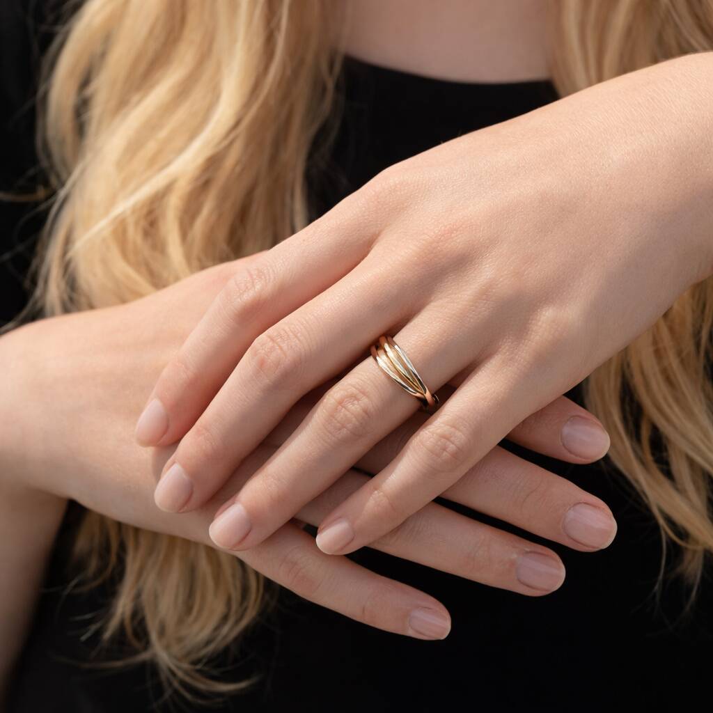 Made from solid 9ct gold throughout, this ring offers lasting quality and a reassuring weight, designed to be worn every day. The smooth, high polish finish enhances the fluid curves of the interlocking bands, allowing the different gold tones to reflect the light beautifully from every angle.