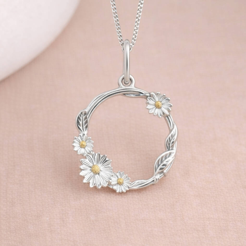 This daisy wreath pendant necklace is crafted from solid 925 sterling silver with 18ct yellow gold plated detailing. Designed as a circular vine adorned with finely detailed daisies and leaves, it creates a graceful, nature inspired silhouette with subtle contrast.