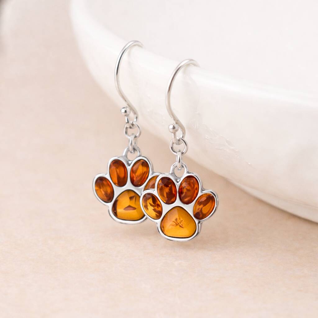 Sterling Silver Baltic Amber Paw Print Drop Earrings – 15mm