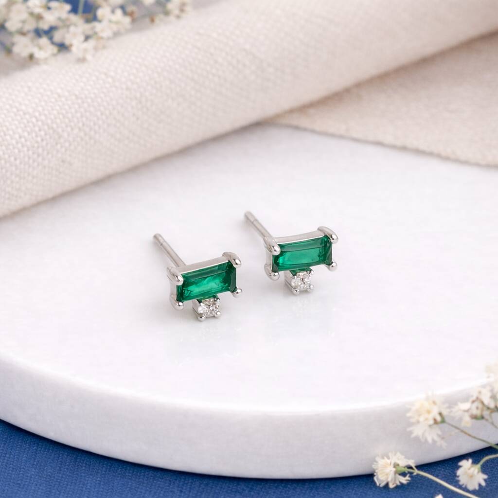 Sterling Silver Emerald Baguette Micro Stud Earrings – 4mm