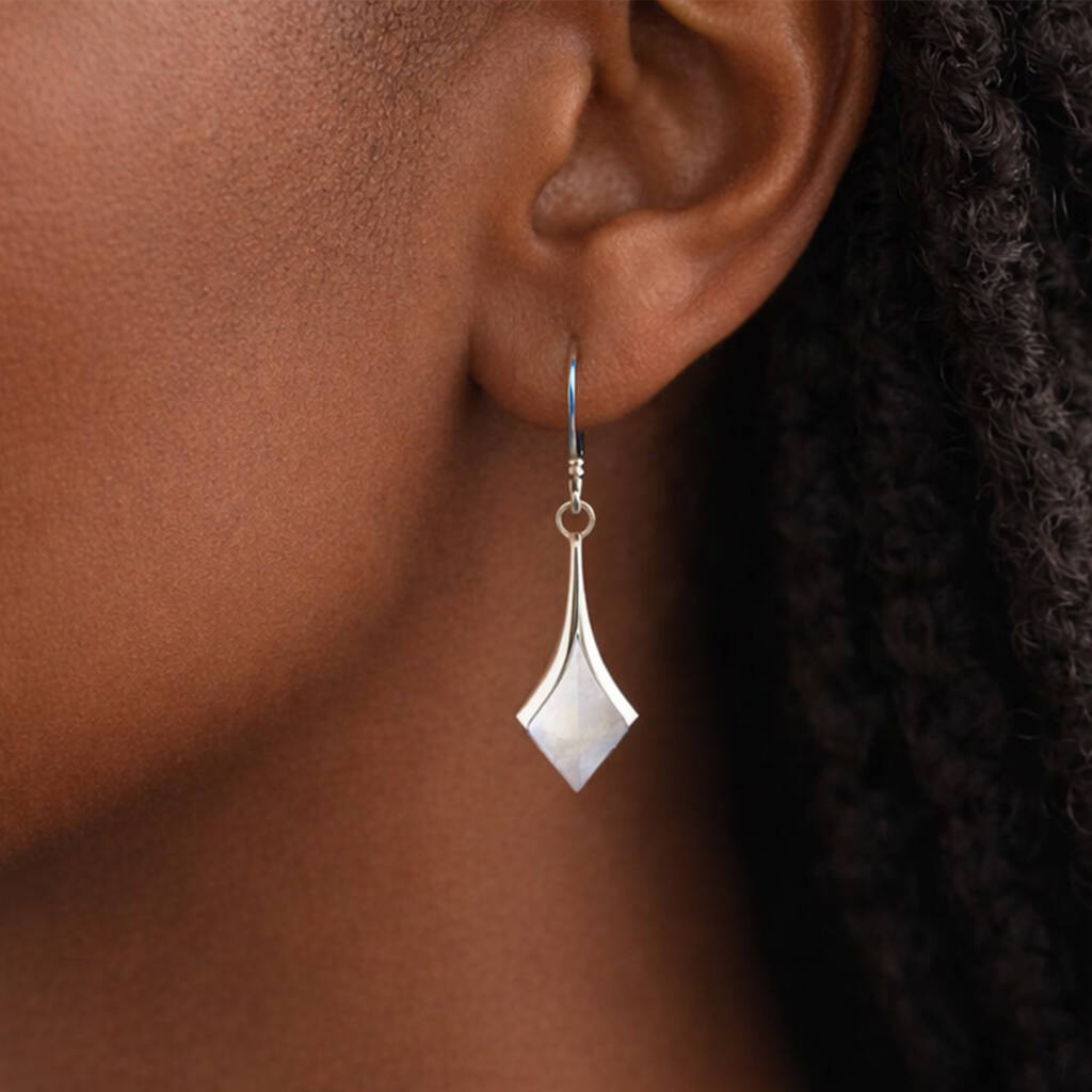 The elongated diamond shaped drop is framed in polished sterling silver, creating a clean, modern silhouette that gently tapers to a refined point. Suspended from classic silver hook fittings, the earrings move beautifully with wear, catching the light across the smooth nacre surface. With a drop height of 30mm and a width of 9mm, they provide noticeable presence while remaining comfortable at approximately 2.40g per pair.