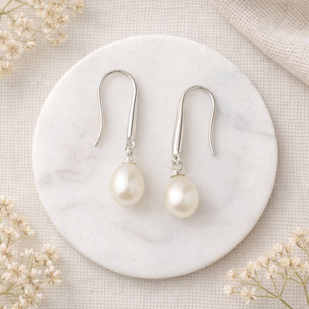 Sterling Silver White Freshwater Pearl Drop Earrings – 8mm
